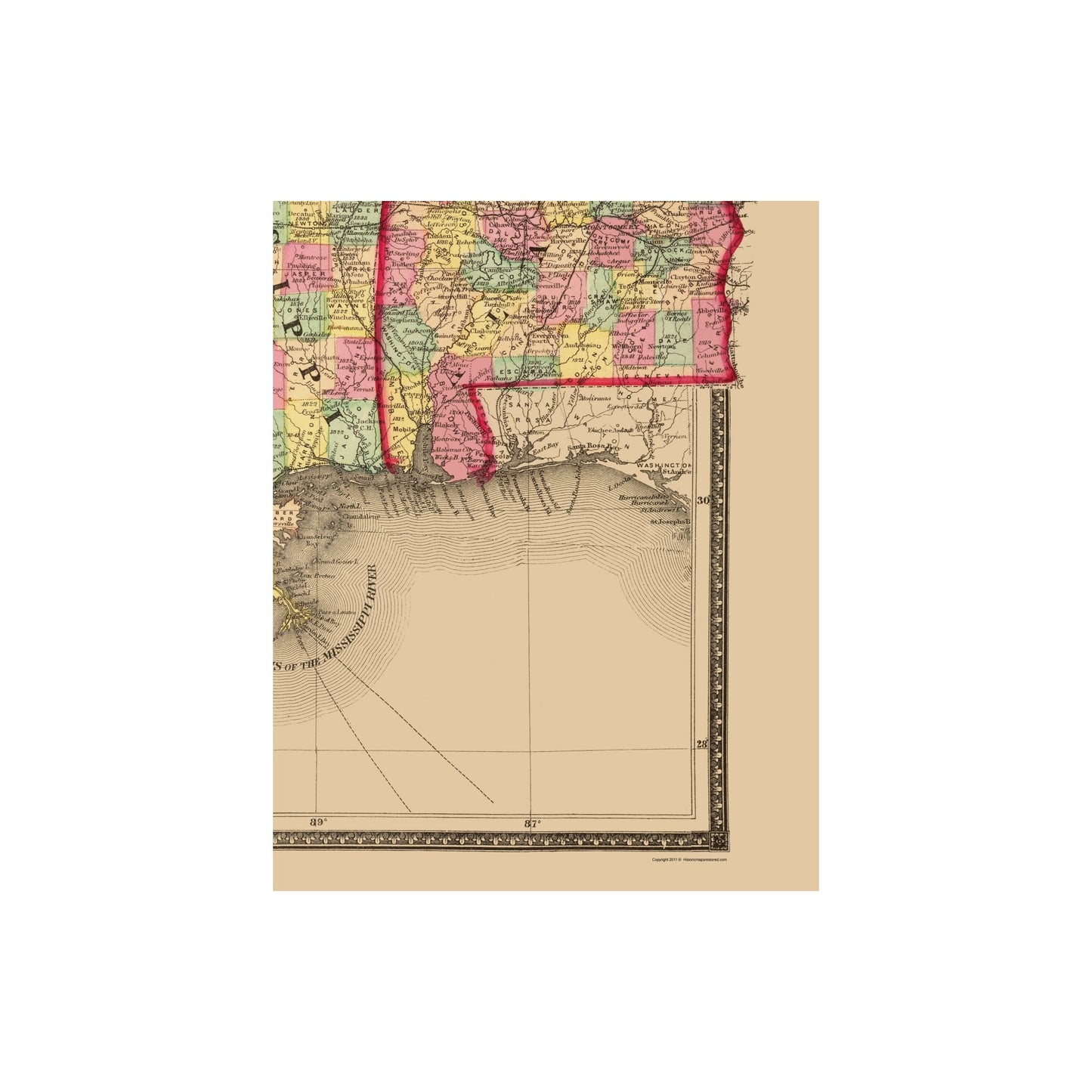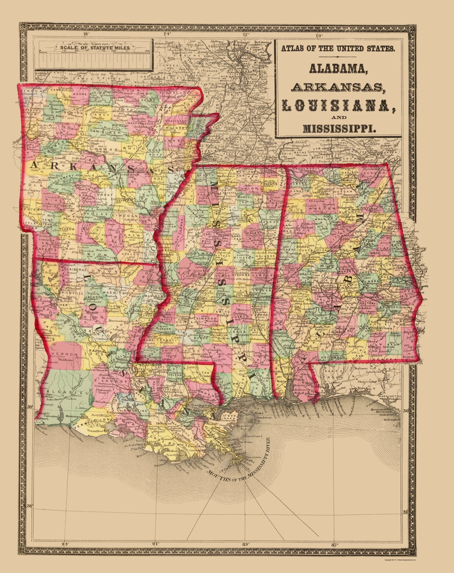 Old State Map - Alabama, Arkansas, Louisiana, Mississippi 1873 - This is an exquisite full-color Reproduction printed on high-quality gloss paper, art paper or canvas.