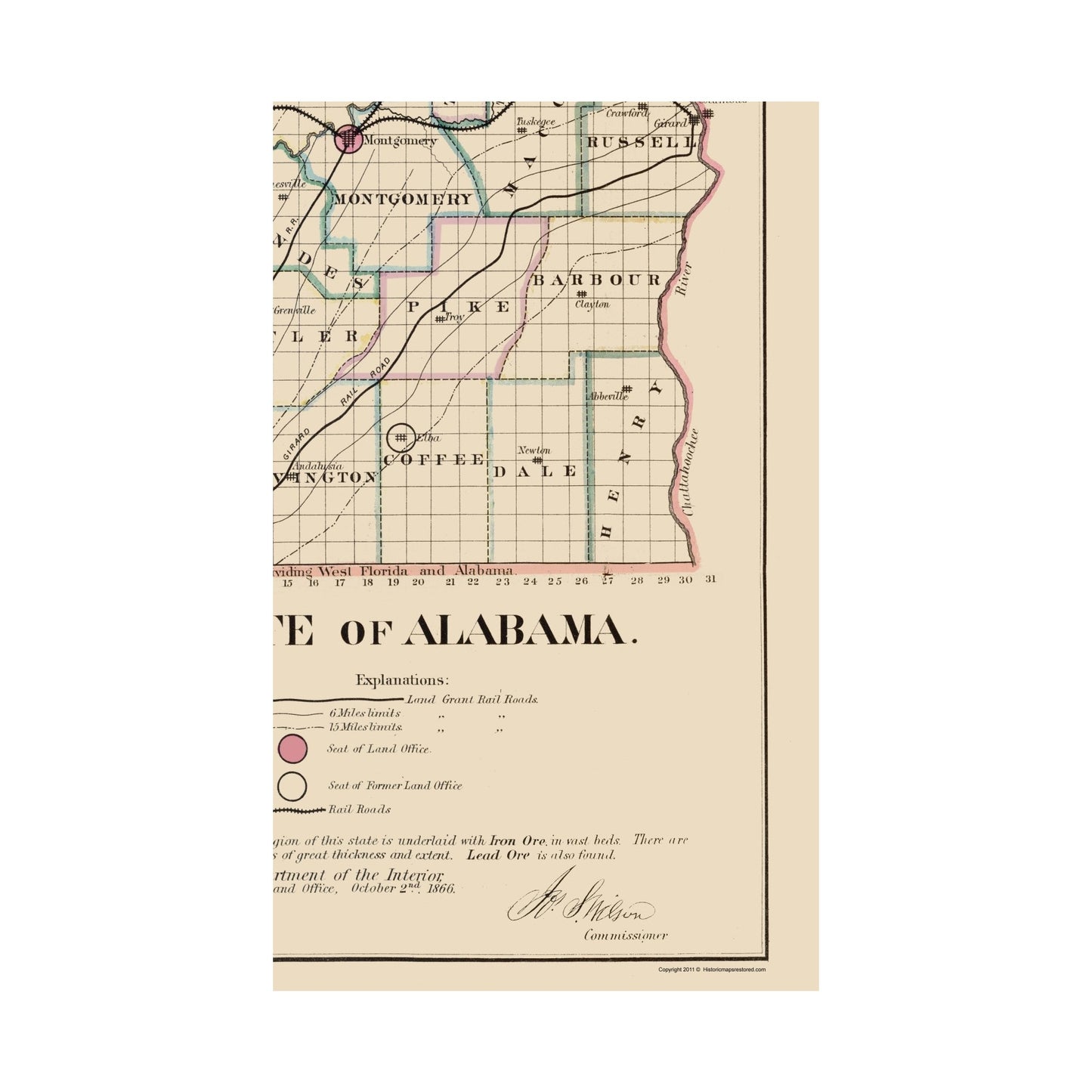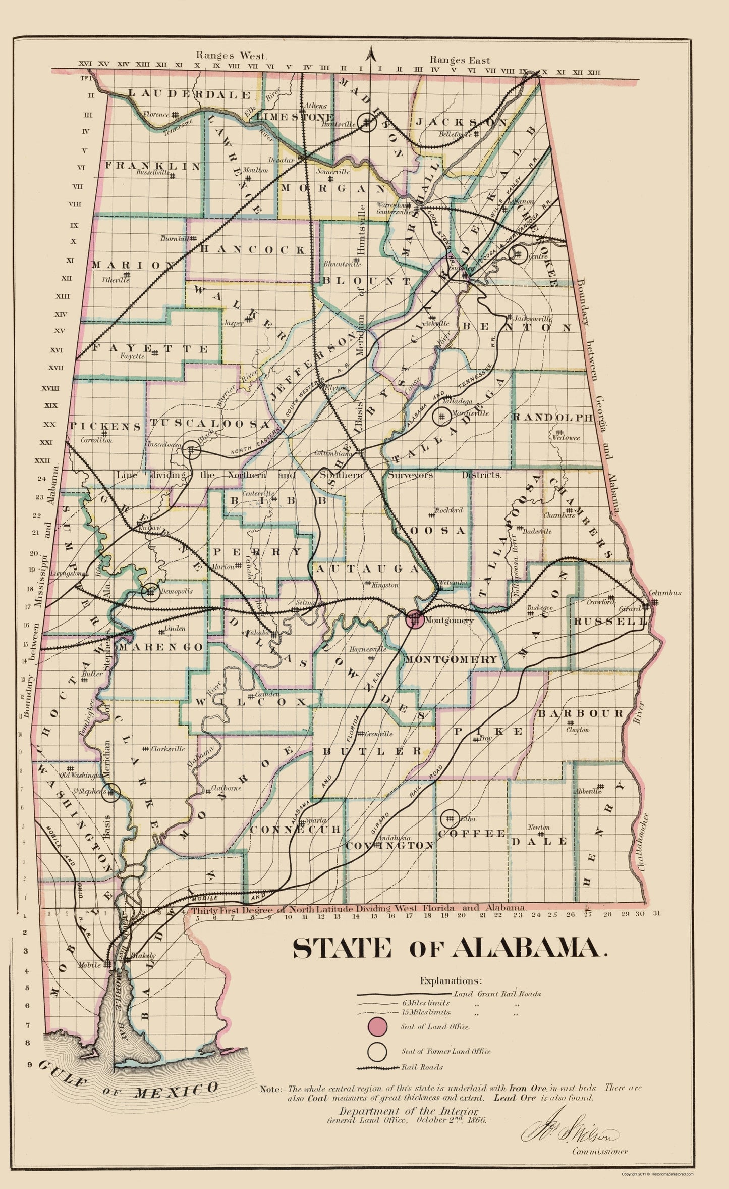 The following towns are featured: an explanation of rail road land grants, and current and former seats of land offices. A notation that the whole central region is underlaid with beds of iron ore and coal, with some lead. Counties are labeled. Waterways are the Tennessee River, Elk River, Coossa River, Blade Warrior River, Tombigbee River, Alabama River, Challahoochee River, and Mobile Bay. Railroads cross the mining regions.
