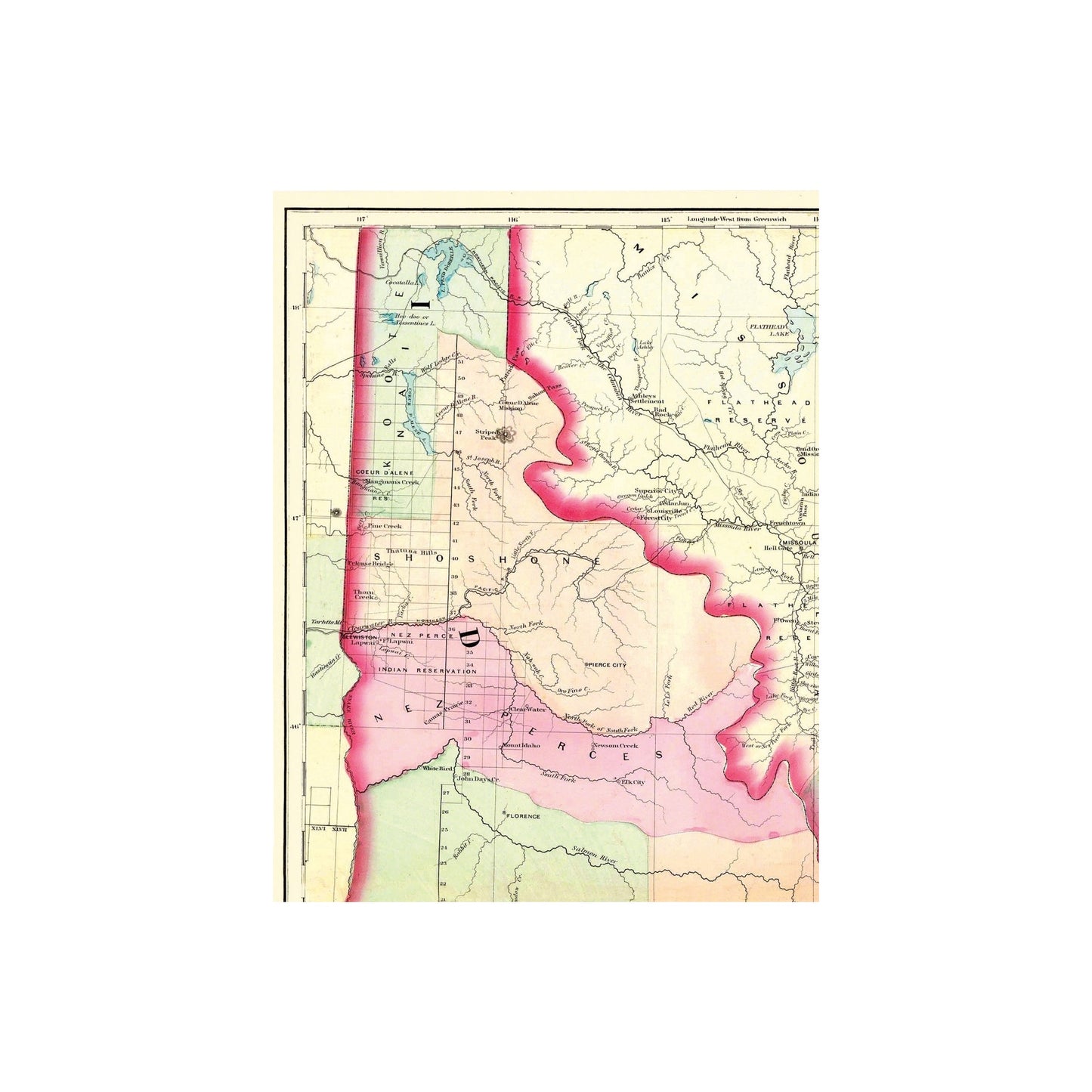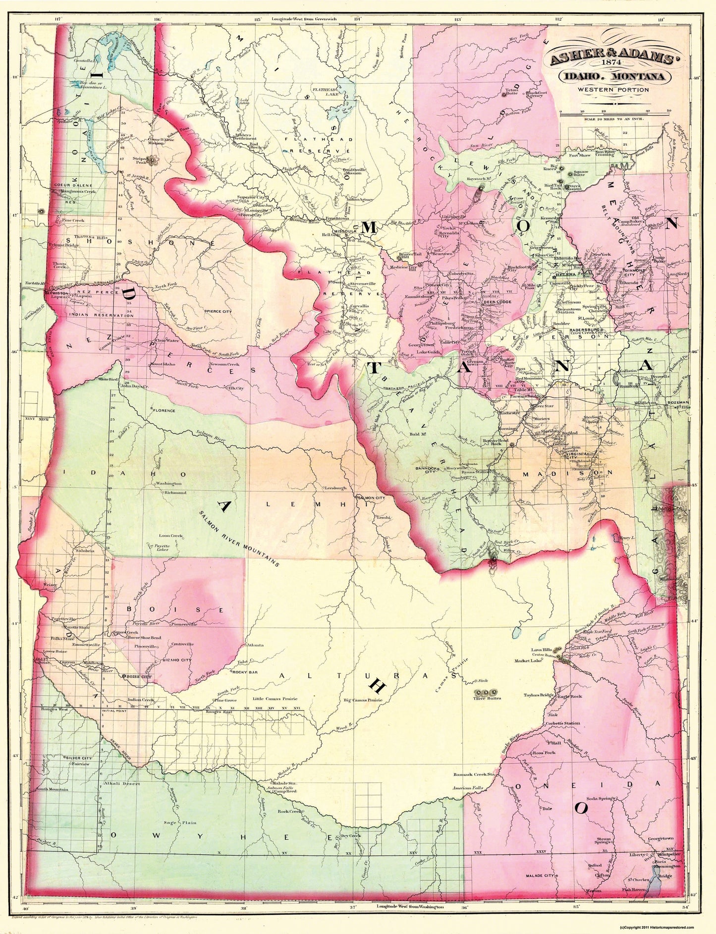 Sites and Townships Specific To This Map Are: Map indicates the Western portion of Idaho and Montana. Counties of: Lodge, Lewis & Clark, Missoula, Deer, Jefferson, Meagher, Gallatin, Madison, Beaver Head, Lemhi, Idaho, Boise, Owyhee, Oneida, Alturas, Nez Perces, and Indian Reservations.