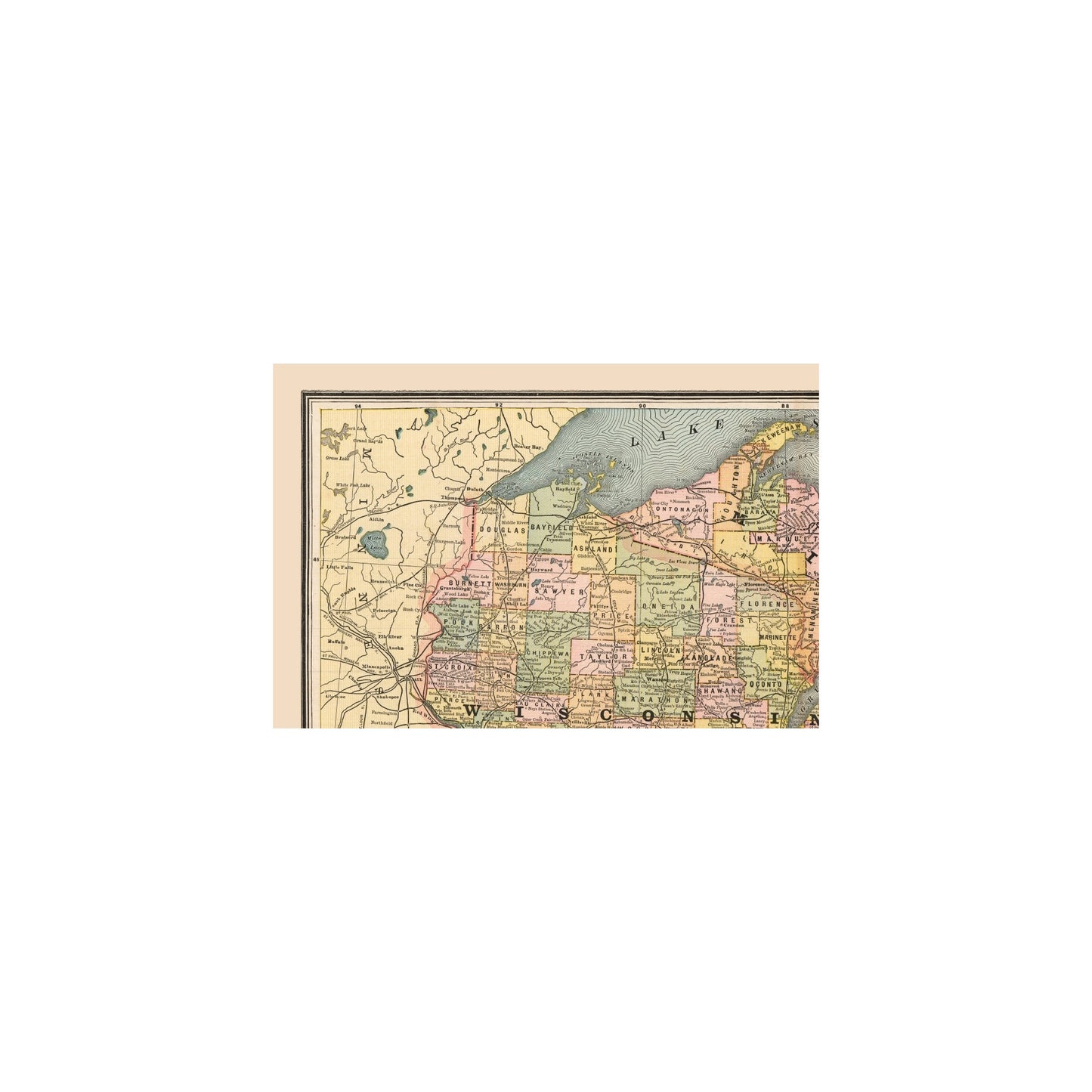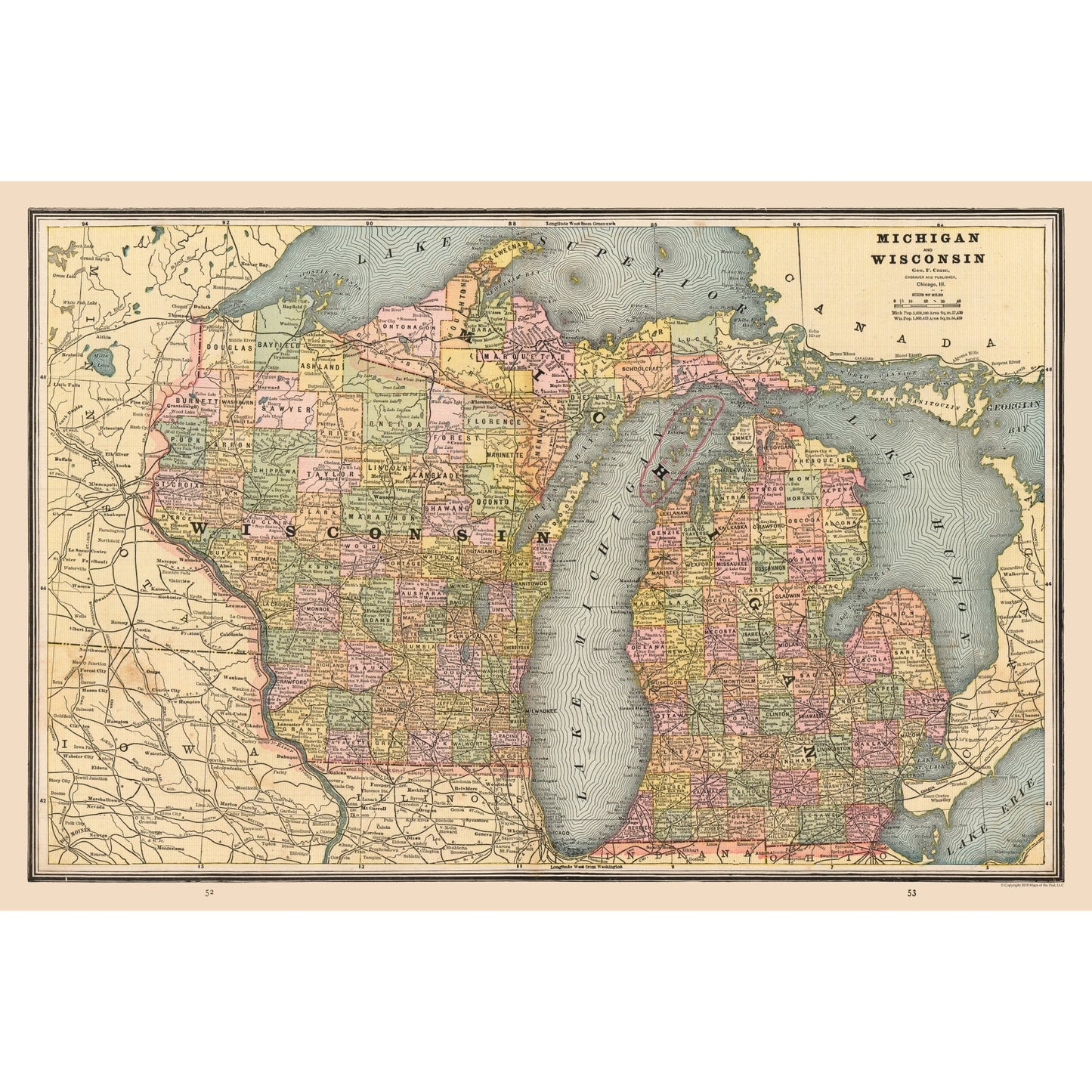 Old State Maps - Michigan and Wisconsin - Cram's Atlas 1888 - This is an exquisite full-color Reproduction printed on high-quality gloss paper, art paper or canvas.