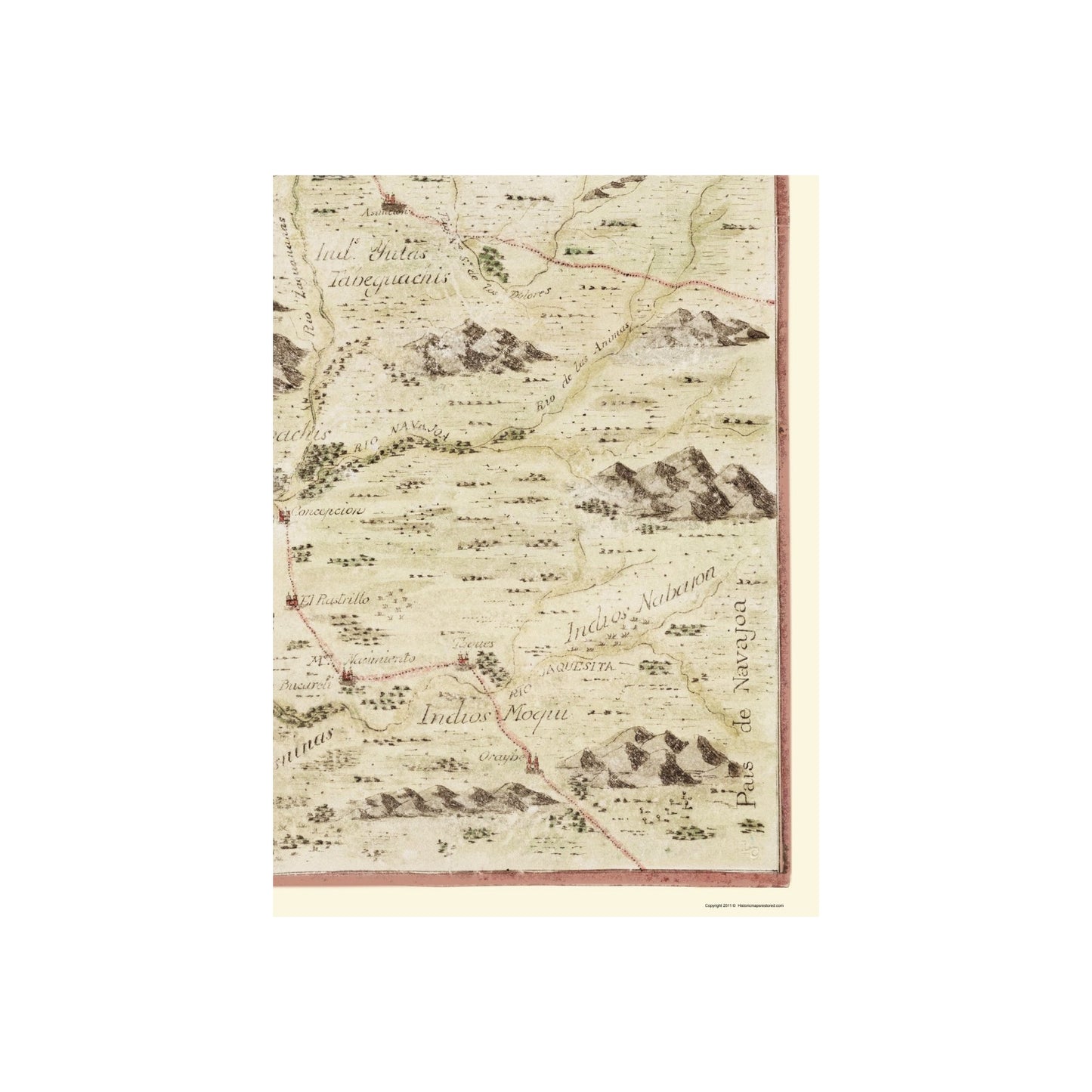 Old State Map - New Mexico Route with Indian Villages, Missions 1777 - This is an exquisite full-color Reproduction printed on high-quality gloss paper, art paper or canvas.