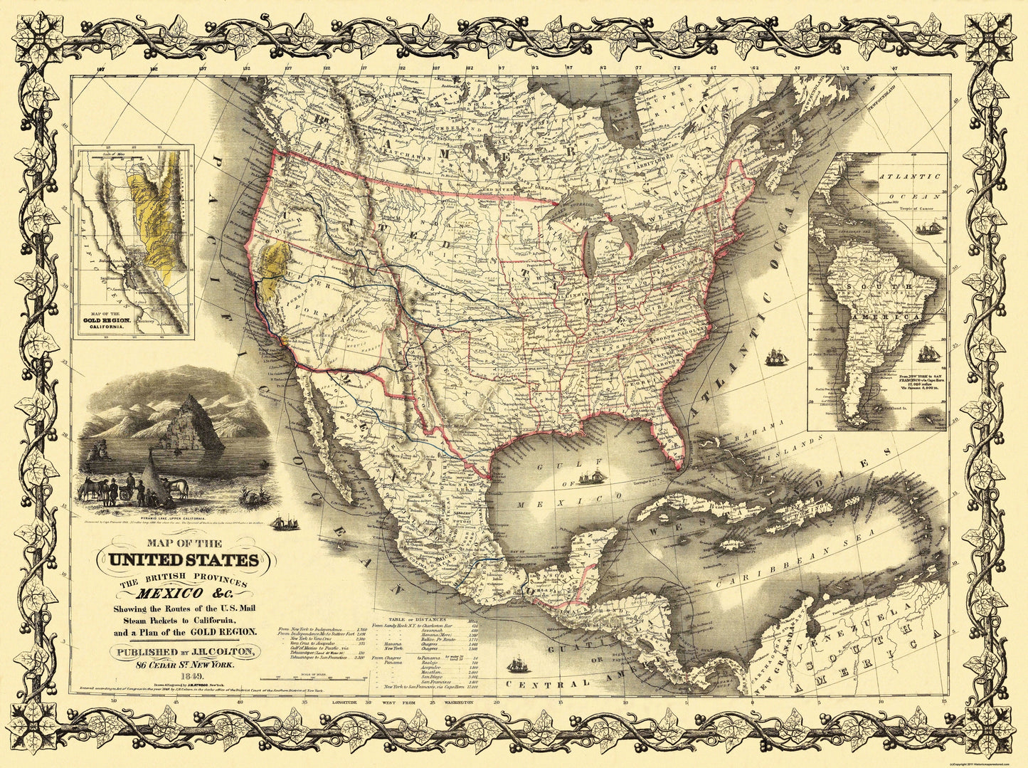 Sites and Townships Specific To This Map Are: The United States, British Provinces, and Mexico. Showing routes of the U.S. Mail Steam Packets to California and a plan of the Gold Region.