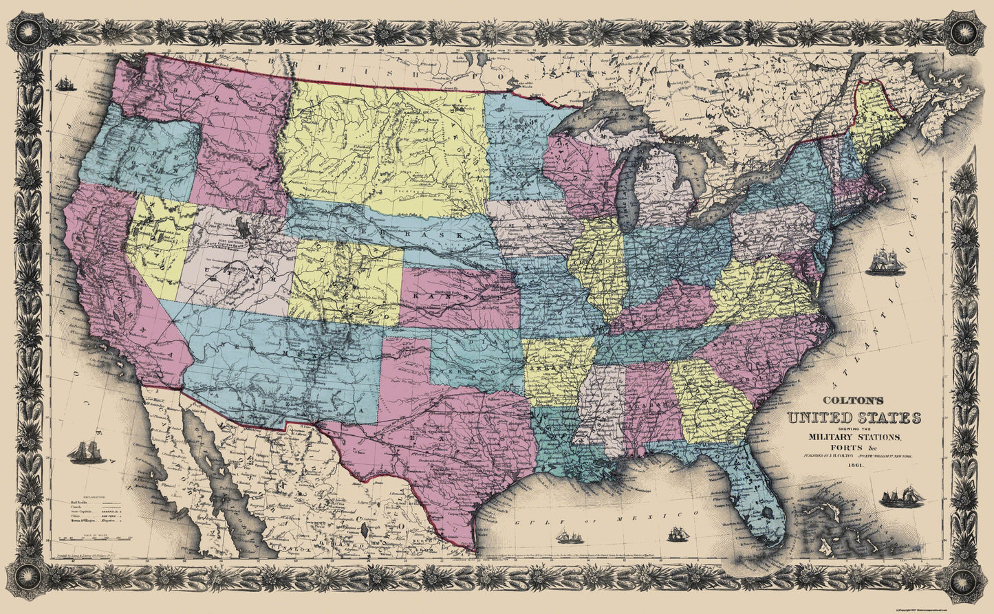 Old State Map - US with Military Stations, Forts - Colton 1861 - This is an exquisite full-color Reproduction printed on high-quality gloss paper, art paper or canvas.