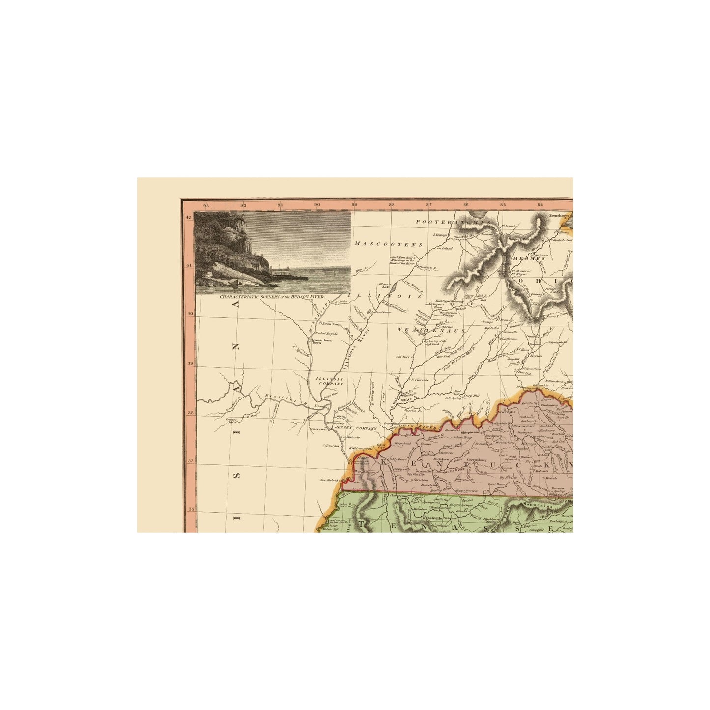 The following towns are featured: a map of Thomson's Southeastern United States, published in Edinburgh. Thomson's map is bounded by the Atlantic, East and West Florida, the Mississippi and Missouri Rivers Lake Erie, Pennsylvania and New Jersey. It features Georgia extending from the Atlantic to the Mississippi River, pre-dating Alabama and Missouri Territories. Indiana appears in northern Virginia. Shows the 1795 Treaty Line south of Lake Erie. The Jersey Company and Illinois Company are shown just north and east of St. Louis. Ohio is named, but not delineated with color. A number of midwestern towns, Indian Villages, Indian Tribes and forts are shown throughout the map, along with other interesting information throughout.