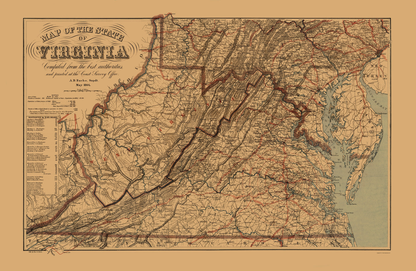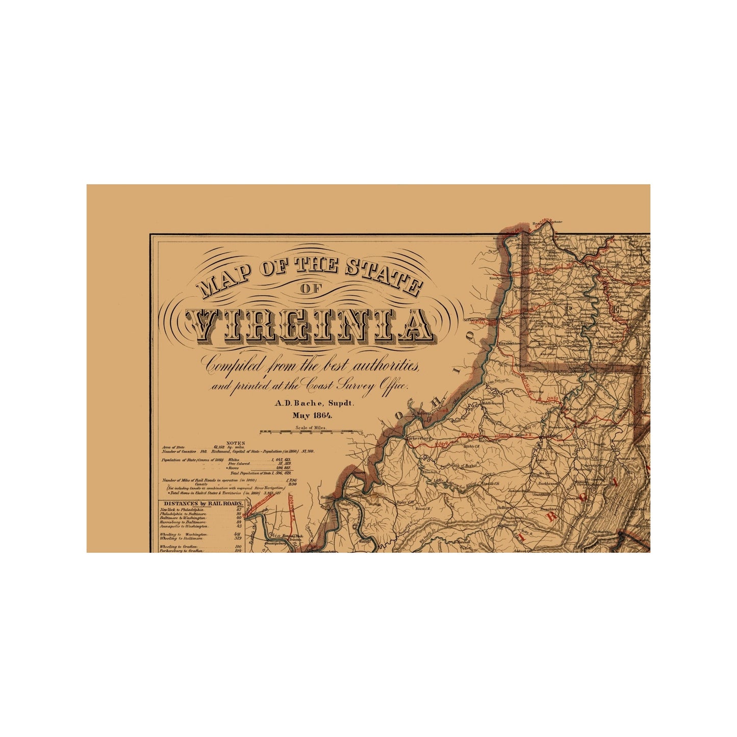 Old State Map - Virginia, West Virginia - Krebs 1864 - This is an exquisite full-color Reproduction printed on high-quality gloss paper, art paper or canvas.
