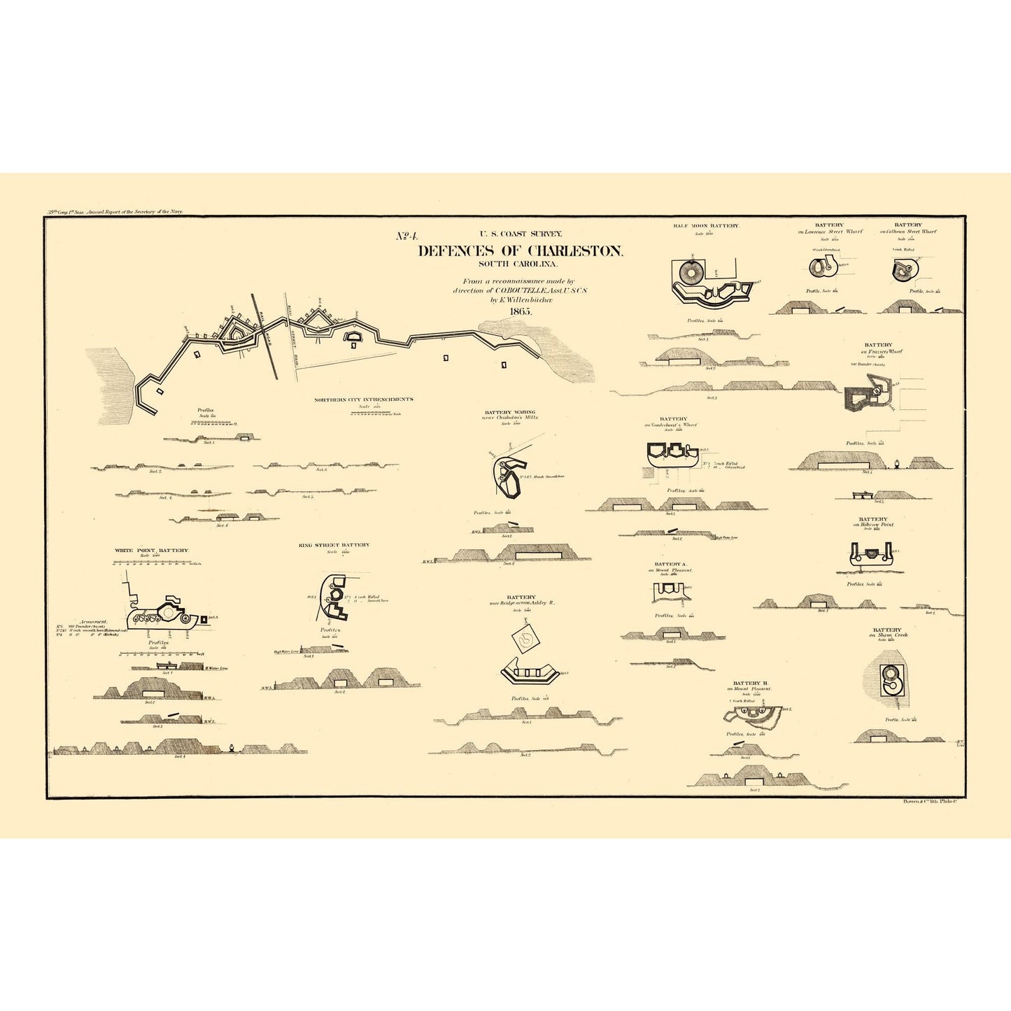Historical Civil War Map - Charleston Coastal Defences - Willenbucher 1865 - 34.92 x 23 - Vintage Wall Art