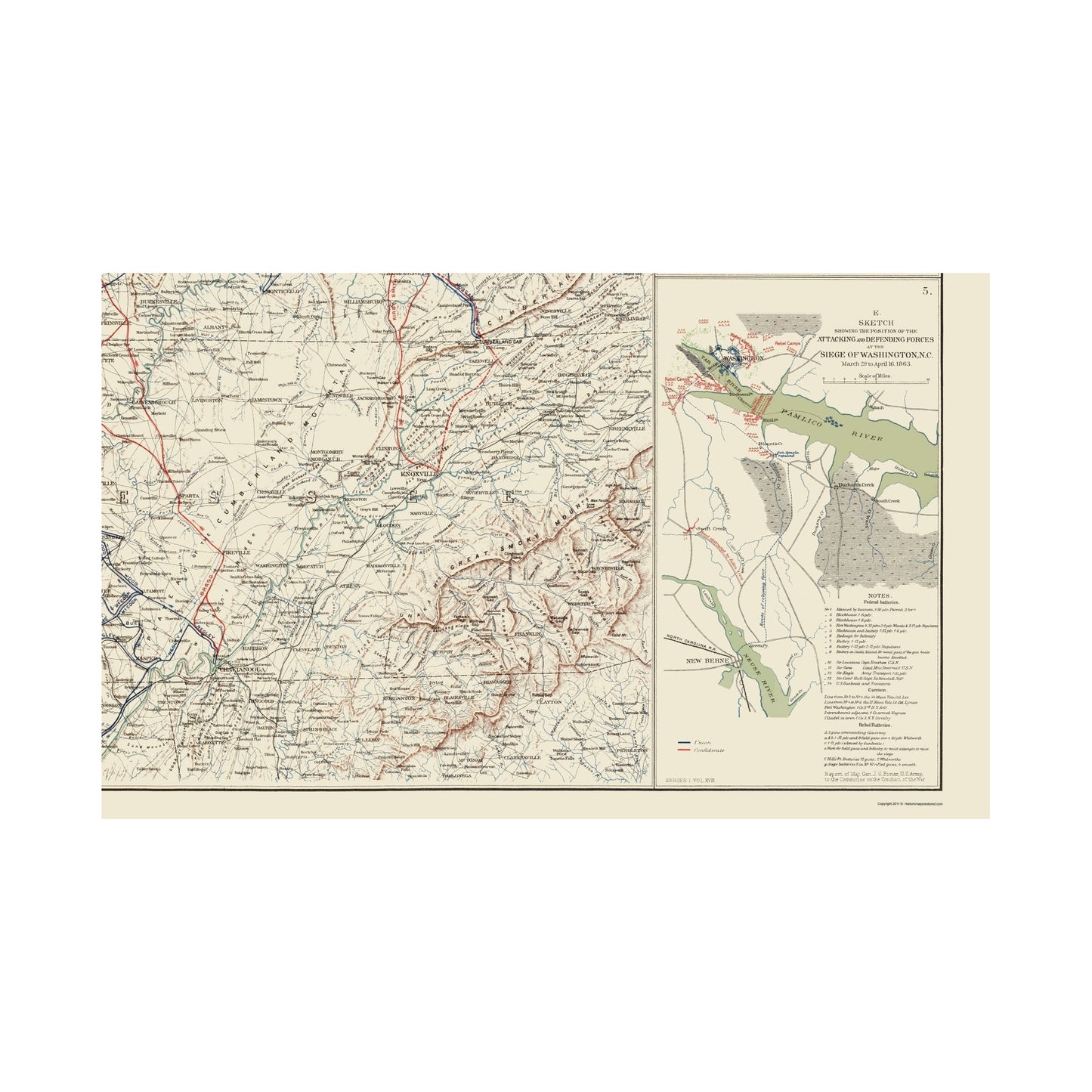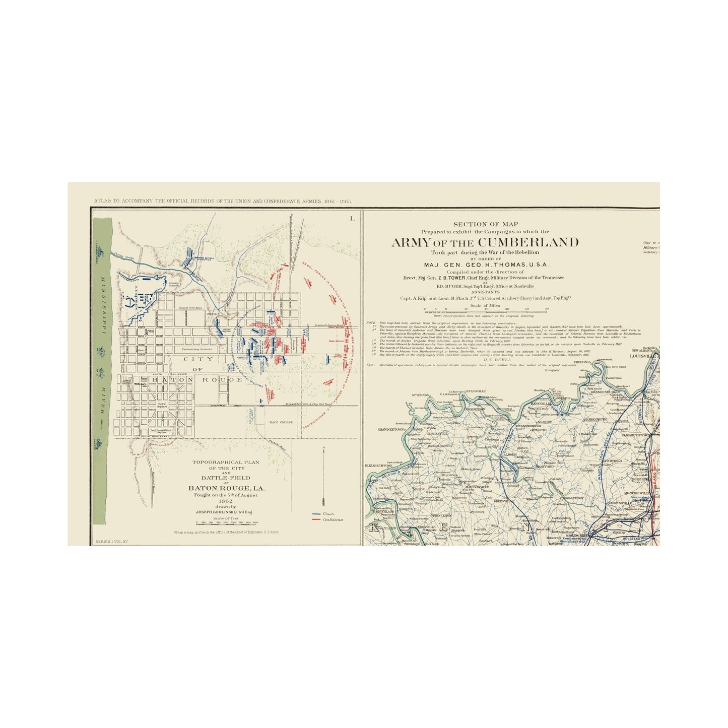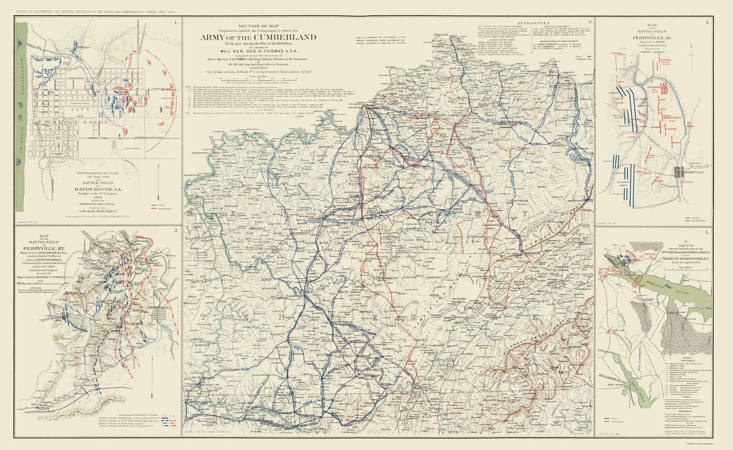 The following towns are featured: inset maps of Baton Rouge, LA, Washington, NC, and two of Perryville, KY. This is very detailed troop movements of the Union and Confederate Armies throughout the cities, as well as the states. A Note Section gives seven indications that the map has been altered from the original impressions. Another note states that all routes of operations subsequent to General Buell's campaigns have been omitted from this section of the original impression.