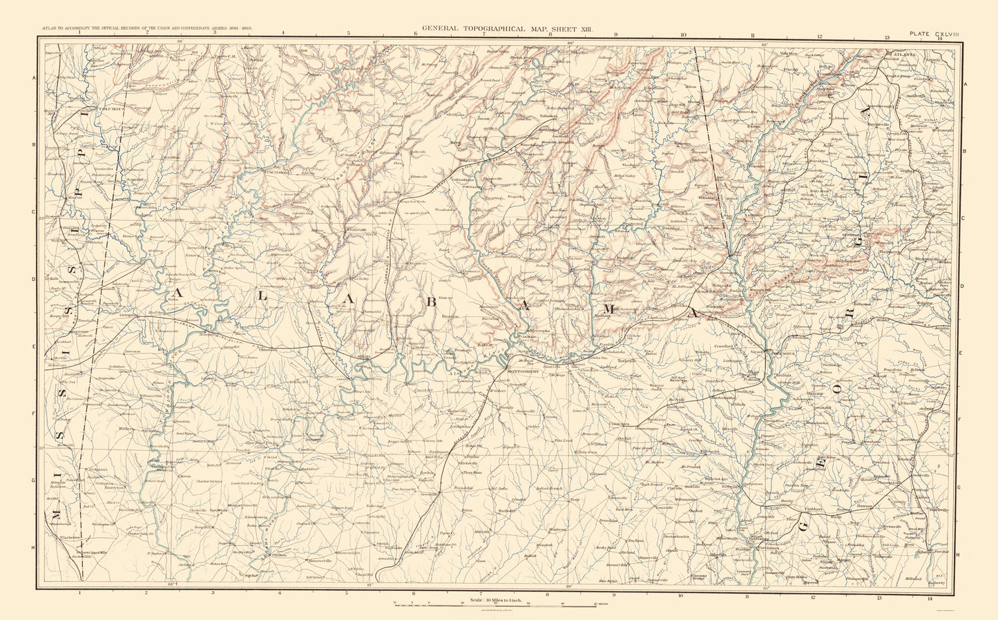 The following towns are featured: a reference map of the States of Mississippi, Alabama, and Georgia from Plate CXLVIII. It is a representation of the area from the Civil War era from the Atlas to Accompany the Official Records of the Union and Confederate Armies from 1861-1865.