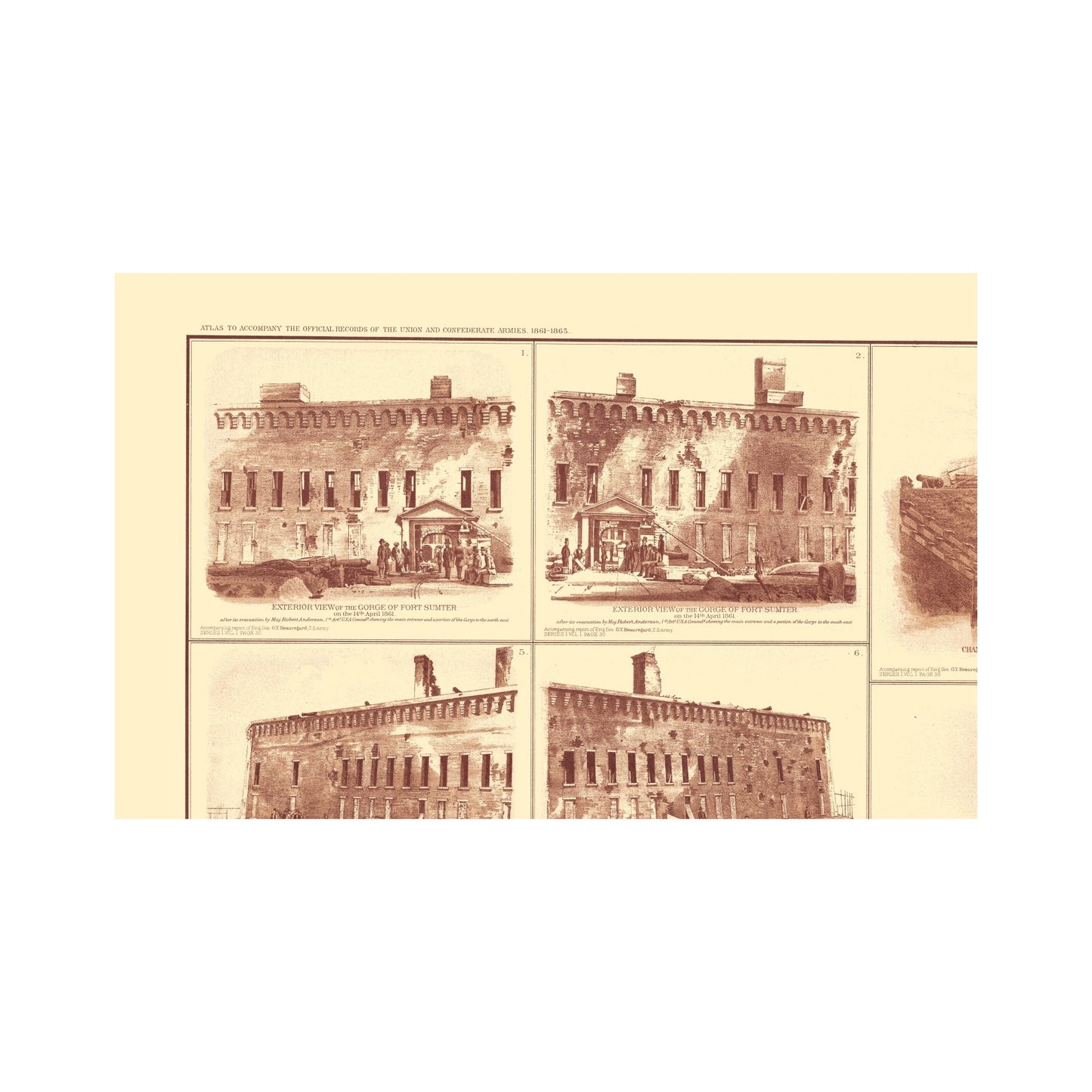 The following towns are featured: diagrams on Plate CXXII from the Atlas to Accompany the Official Records of the Union and Confederate Armies, 1861-1865. Diagrams include: 1. Exterior View of the Gorge of Fort Sumter, SC, April 14, 1861; 2. Exterior View of the Gorge of Fort Sumter, SC, April 14, 1861; 3. Channnel Face of Fort Moultrie, SC, with Bomb-proof Shelter and Flag-staff, April 16, 1861; 4. View of Southeast Angle, Fort Sumter, SC, December 9, 1868; 5. Exterior View of the Gorge of Fort Sumter, SC, April 14, 1861; 6. Exterior View of the Gorge of Fort Sumter, SC, April 14, 1861; 7. Sullivan's Island, SC, Battery Beauregard, 1864; 8. Interior View of Three-Gun Battery, Fort Sumter, SC, December 9, 1863; 9. View from Southwest Angle, Fort Sumter, SC, December 9, 1863; 10. Sullivan's Island, Fort Moultrie, SC, 1864; and 11. View of Entrance to the Three-Gun Battery, Fort Sumter, SC, December 9, 1868.