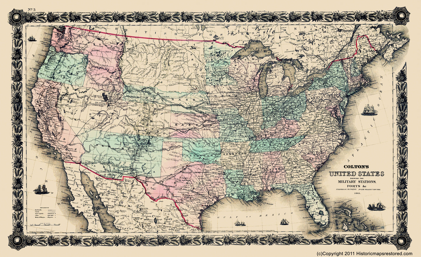 Civil War Map - United States With Military Stations Forts - 1861 - This is an exquisite full-color Reproduction printed on high-quality gloss paper, art paper or canvas.