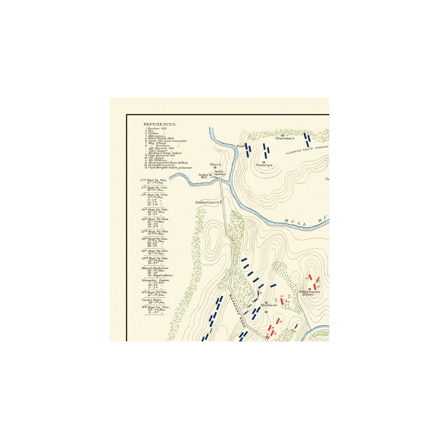 The following towns are featured: Warrenton Turnpike, Panassas Road, Sudley Church, Sudley Mill, Sudley Springs, Flanking Route Pursued by the Federal Army, Bull Run, Black Horse & Chesterfield Cavalry, Balls Ford, Island Ford, Lewis Ford, Stone Bridge, Warrenton Turnpike, Federal Guns (these guns opened the action), Federal Skirmishers, Carlisles Battery, Red House and Red House Ford. There is a chart of references and an explanation of symbols used throughout the map to designate the Confederate Infantry, Confederate Artillery, Federal Infantry, Federal Artillery, Cemetery 8th Ga. Regt., Where Distinguished Men Fell, Oak Woodland and Pine Woodland.