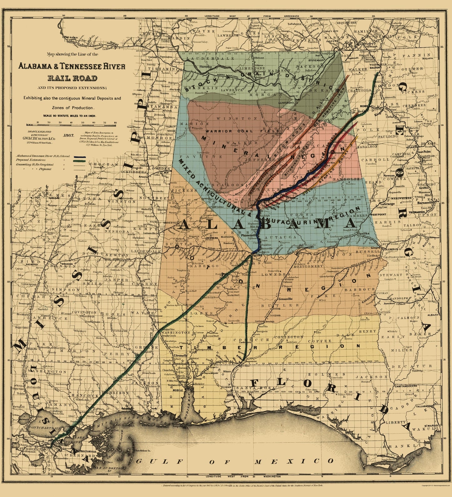 The following towns are featured: mineral deposits with the areas of production. State shown areas of Timber Region, Cotton Region, Mixed Agricultural & Manufacturing Region, Mineral Region, Coal & Iron Region, and Stock & Grain Districts. Rail lines include the Memphis & Charleston RR, Tennessee & Alabama RR, Alabama & Mississippi River RR, Mobile & Girard RR, and the Montgomery & West Point Railroad.