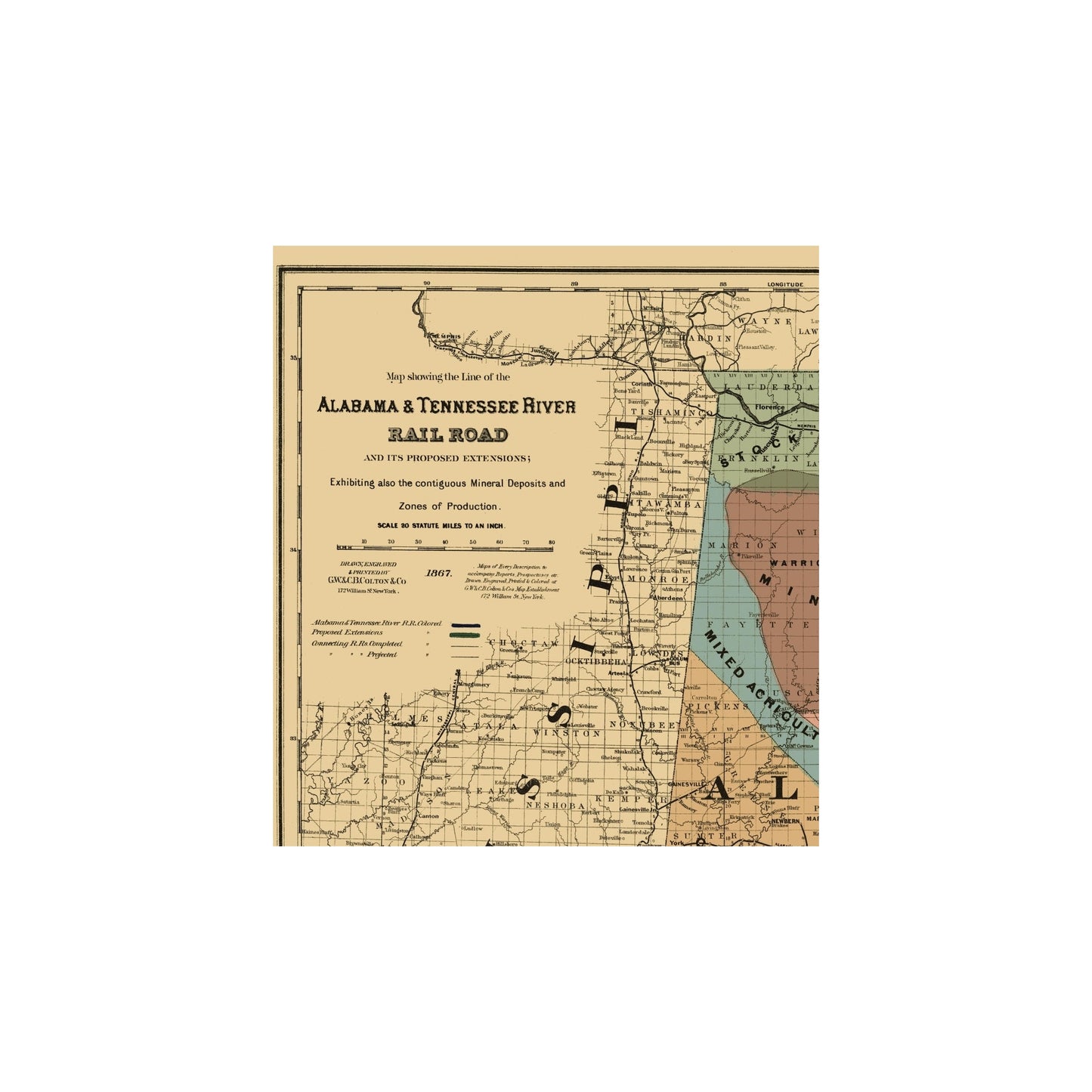 Old Railroad Map - Alabama and Tennessee River Railroad - Colton 1865 - This is an exquisite full-color Reproduction printed on high-quality gloss paper, art paper or canvas.
