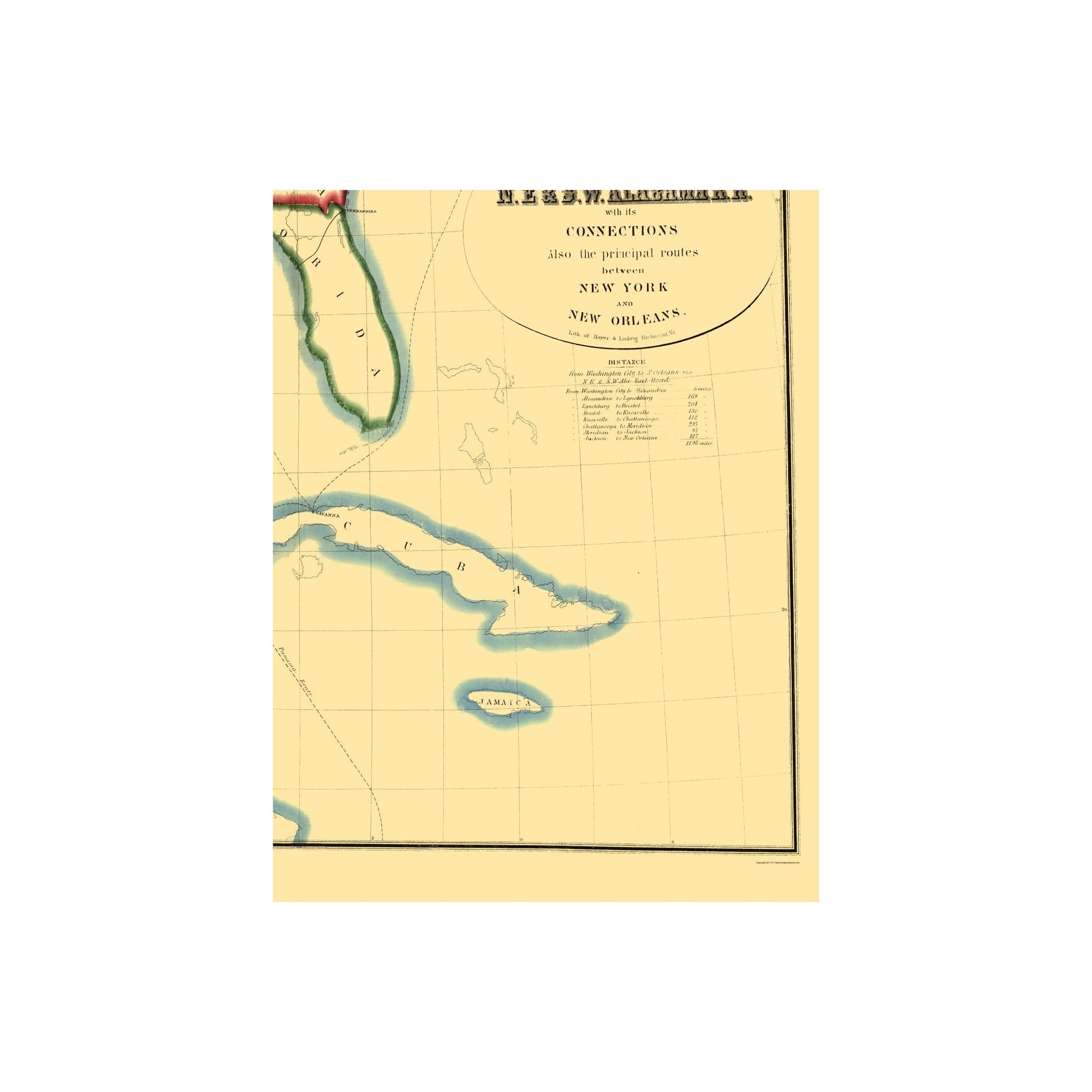 The following towns are featured: the N.E. & S.W. Alabama R.R. with its connections, with the principal routes between New York and New Orleans. This is an outline map of the eastern United states including Cuba and the Gulf of Mexico. It shows the railroad network and steamship routes and indicates the railroad land grant and the coal and iron deposits in Alabama. Distances from Washington, D.C., to New Orleans, La. are shown below the title. The line was chartered in 1853 and 1854, and consolidated with the Wills Valley Railroad, forming the Alabama and Chattanooga Railroad.