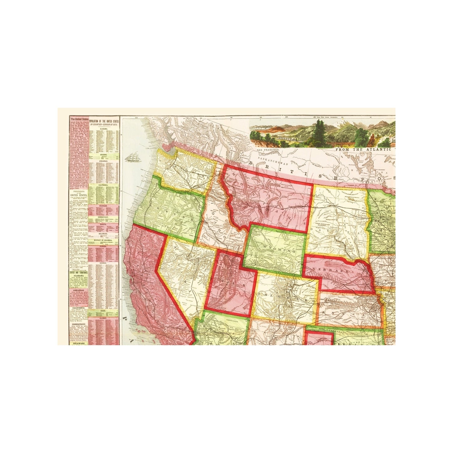 The following towns are featured: information on the United States and details of each state within including population data, the size of each territory, capitals, and the time frame of when the state was annexed into the United States. Also shown is a reference table showing the time and distance between Washington and many important cities throughout North and Central America along with an inset of Central America detailing the territories. Also shown are the Northern Pacific R.R., Central Pacific R.R., Southern Pacific R.R., Kansas Pacific R.R., Lake Erie, Lake Michigan, Lake Huron, Lake