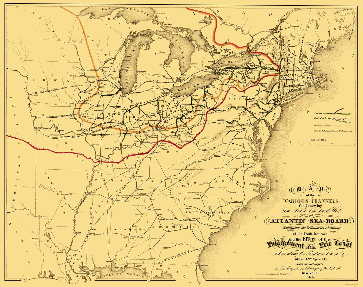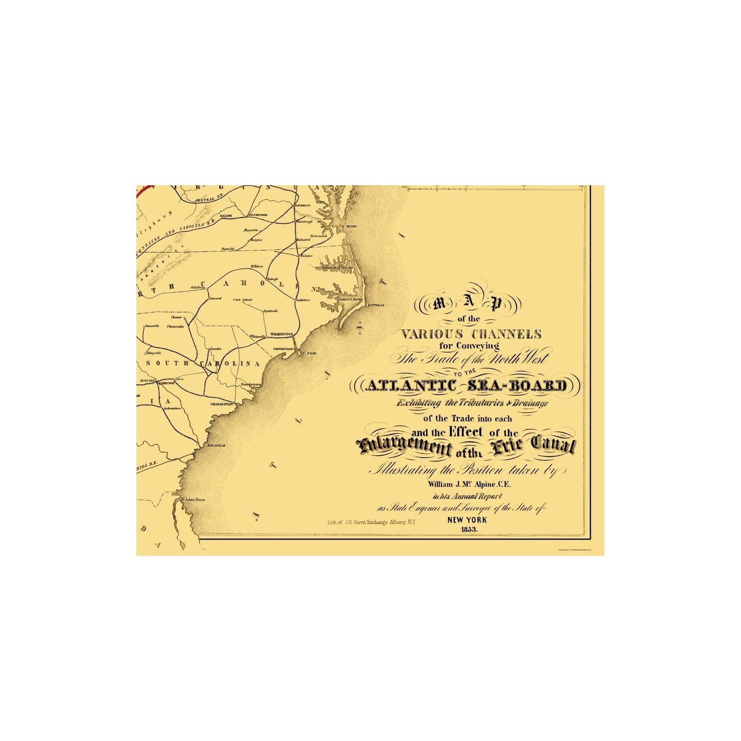 Old Railroad Map - Atlantic Seaboard Trade Routes - Alpine 1853 - This is an exquisite full-color Reproduction printed on high-quality gloss paper, art paper or canvas.