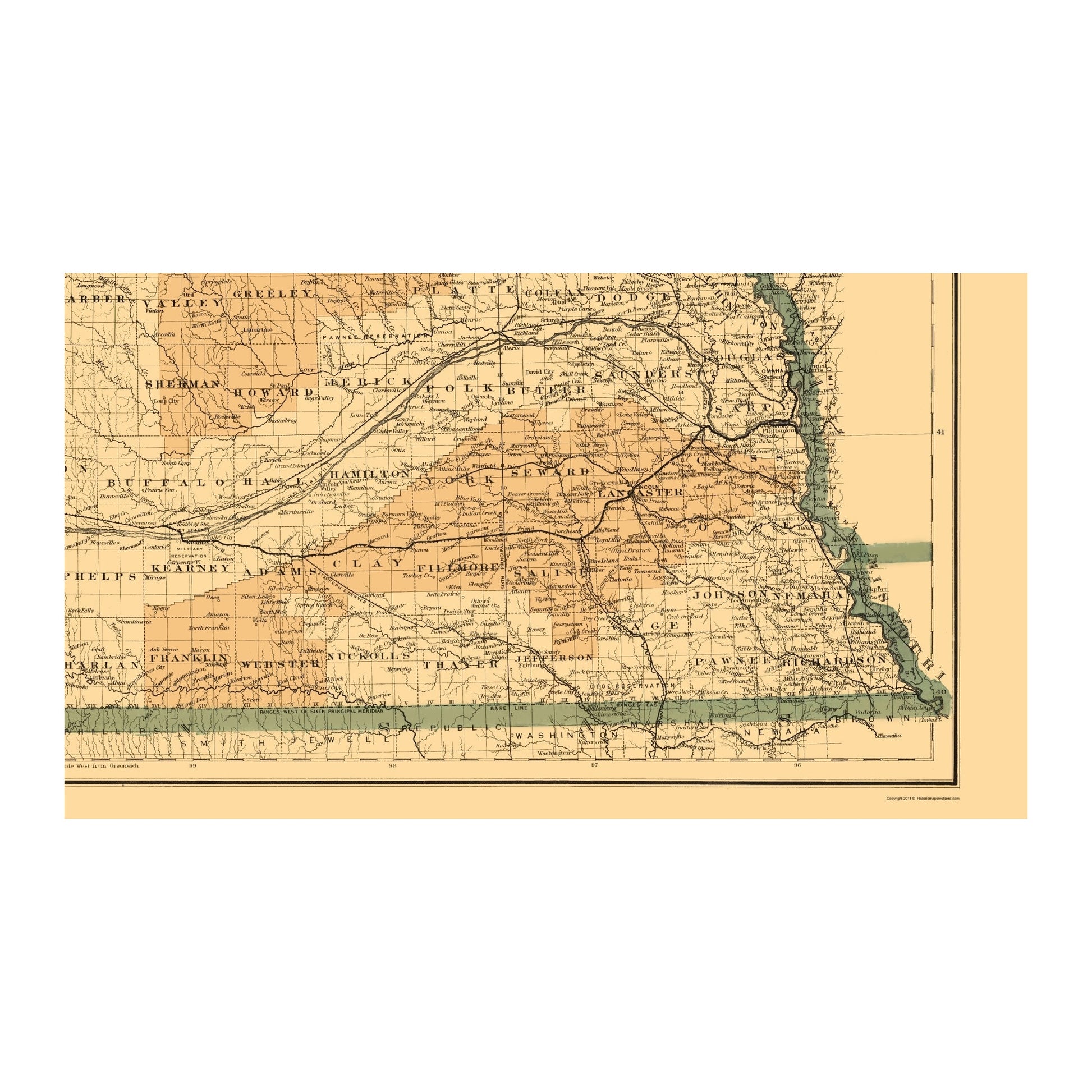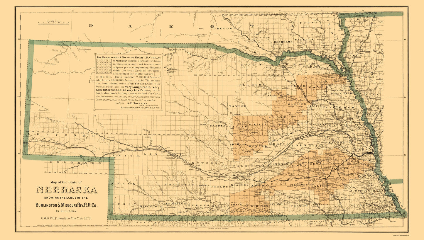 The following towns are featured: This map shows the state of Nebraska with an emphasis on railroads and real estate in the eastern portion of the map. Notable features include: Loup River, Niobrara River, Missouri River, Platte River, Union Pacific R.R., Burlington and Missouri Riv. R.R., Midland Pacific R.R., Omaha and N. Western R.R., Fort Kearney, Indian Reservations and counties.In the top left corner of the map is an explanation for the lands on sale in the eastern portion of the map.