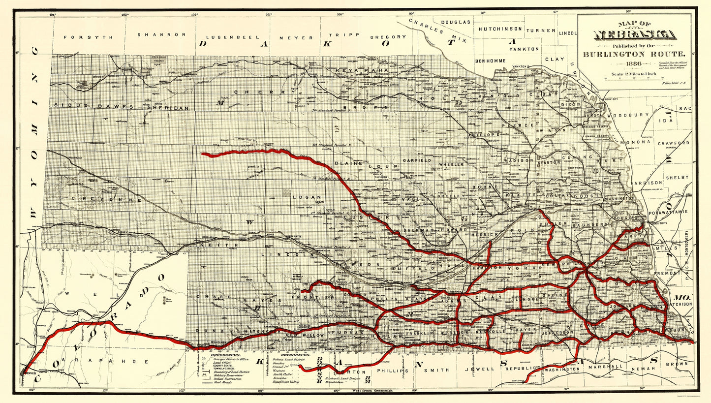 The following towns are featured: the counties of Sioux, Dawes, Sheridan, Cheyenne, Keith, Cherry, Logan, Lincoln, Keya Paha, Brown, Blaine, Loup, Logan, Lincoln, Dawson, Garfield, Wheeler, Valley, Greeley, Merrick, Sherman, Howard, Buffalo, Hall, Hamilton, York, Seward, Butler, Colfax, Dodge, Stanton, Cuming, Wayne and others. Also shown are the Fremont and Elkhorn R.R., Fremont, Elkhorn and Missouri Valley R.R., Chicago, St. Paul and Minnesota R.R., Sioux City and Pacific R.R., Maple River R.R., Chicago and Northwestern R.R., Chicago, Rock Island and Pacific R.R., Chicago, Milwaukee and St. Paul R.R., Kansas City, St. Joseph and Council Bluffs R.R., N. CT. S. &. N.E. R.R., C. B. & O. R.R., St. Joseph and W