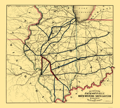 The following towns are featured: Map showing the Jacksonville North Western and South Eastern Railway and its connections. Map of Illinois, Indiana, and parts of adjacent states showing drainage, stations, and the railroad network.