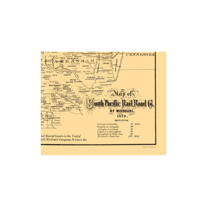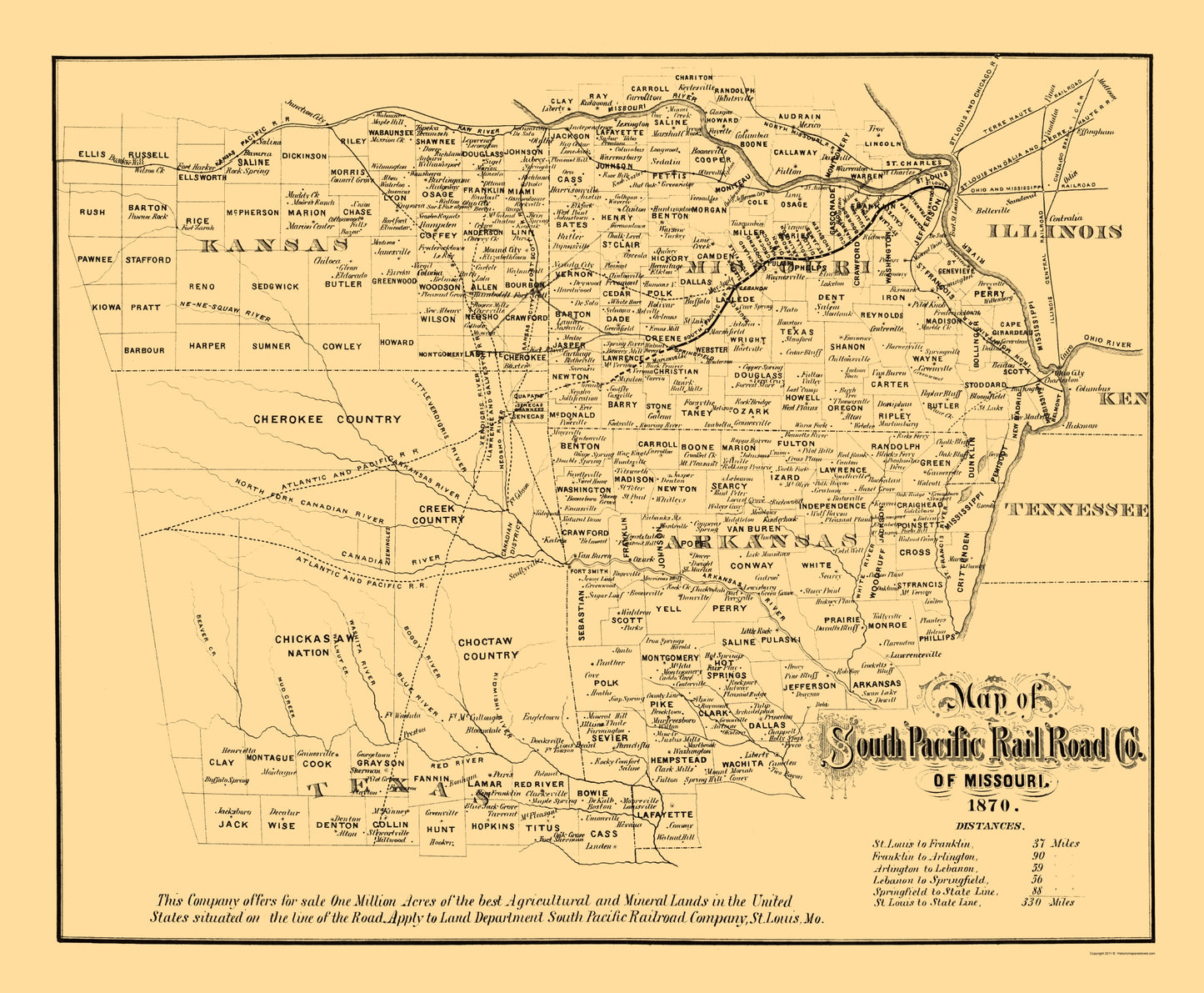 Old Railroad Map - South Pacific Railroad Co of Missouri - Gast 1870 - This is an exquisite full-color Reproduction printed on high-quality gloss paper, art paper or canvas.