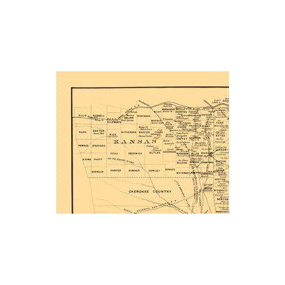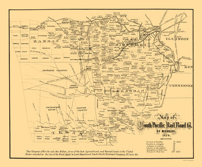 The following towns are featured: South Pacific Railroad and its connection in the Midwest are shown here. Railroad lines include: South Pacific R.R., Atlantic Pacific R.R., Iron Mountain R.R., Illinois Central R.R., Kansas City and Fort Scott R.R.,St. Louis Chicago R.R., Kansas Pacific R.R., and Lawrence and Galveston R.R. Features of significance include: Ne-Ne-Squaw River, North Fork Indian River, Arkansas River, Missouri River, Mississippi River, Ohio River, White River, Chickasaw Nation, Choctaw Country, Cherokee Country, and many counties. In the bottom right corner is a list of distances between major cities.