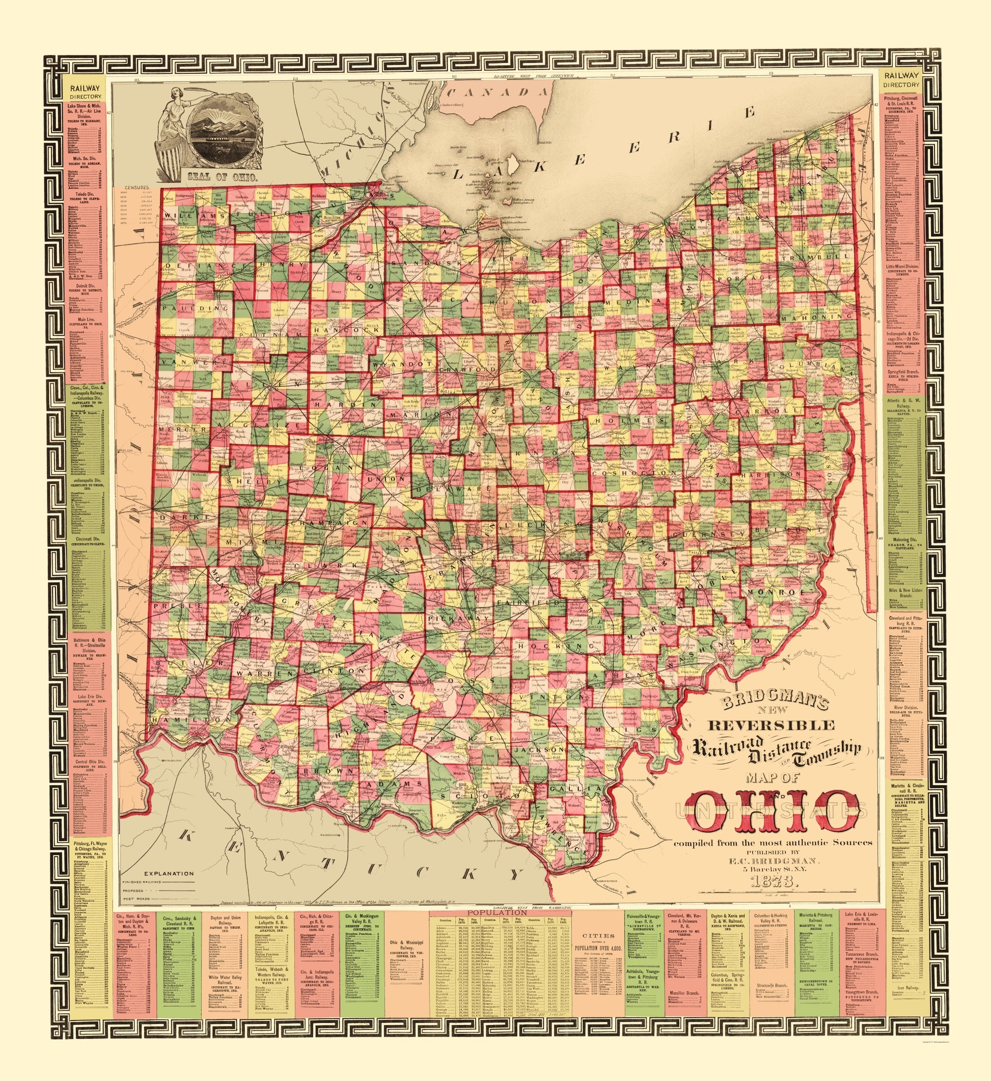 Railroad Map - Ohio Railroad Distances and Townships - Bridgman 1873 - 23 x 25 - Vintage Wall Art