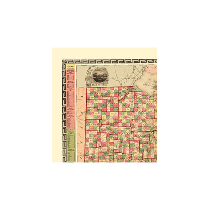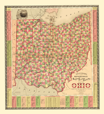 The following towns are featured: Ohio, with counties outlined in red and townships shaded in alternating colors. A Railroad directory shows the Pittsburg Cincinnati & St Louis RR (Pittsburg, PA to Richmond, IN), Little Miami Division (Cincinnati to Columbus), Indianapolis & Chicago Div-2d Div (Columbus to Logansport, IN) and the Springfield Branch (Xenia to Springfield) with stops. Also shown are the Atlantic & G W Railway (Salamanca, NY to Dayton, OH), Mahoning Div (Sharon, PA to Cleveland, OH), and Niles & New Lisbon Branch. The Cleveland and Pittsburg RR, River Division, and finally the Marietta & Cincinnati RR with stops.City population tables are shown, as well as reverse directions for all rail lines.