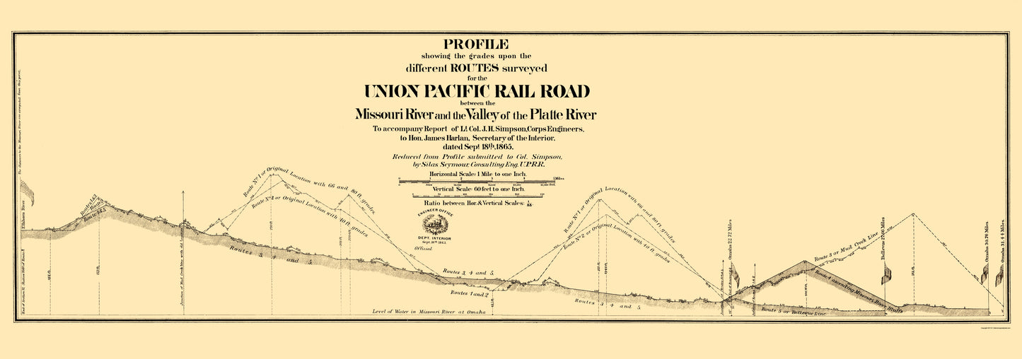 The following towns are featured: The profile of the different routes, surveyed for the Union Pacific Railroad, between the Missouri River and the Valley of the Platte River. There are a total of five routes with a maximum elevation of two hundred and twenty three feet. In the center of the map are numerous scales used for engineering.