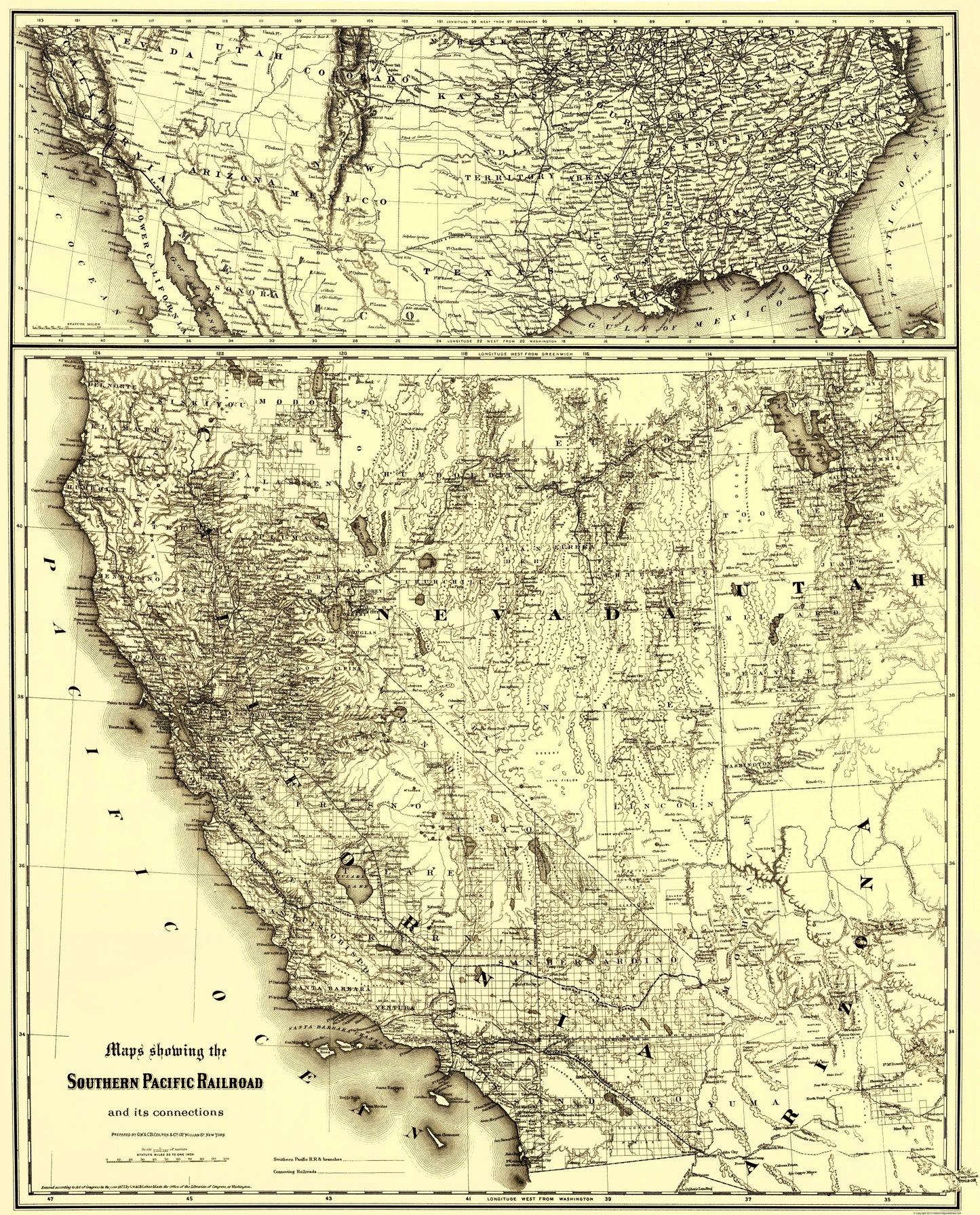 The following towns are featured: an upper and lower map. Upper map shows the entire U.S. with connections to the Southern Pacific line. The lower map focuses on the Southwest through California, and shows divisions. Mountain ranges and other geographical points are labeled.