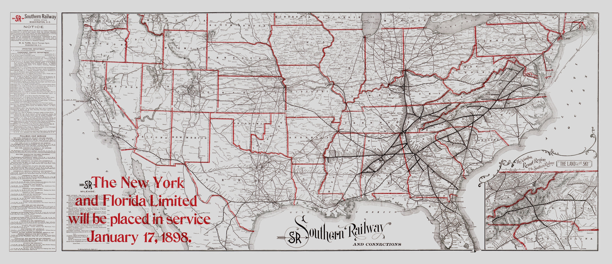 The following towns are featured: the United States showing relief by hachures, drainage, state boundaries, cities and towns, stations, named lines of railroads, and the railroad network with the main lines emphasized. It was chartered in 1894. An Inse is shown for The Montana resort region of the Southern Railway...The Land of the Sky. Information about the rail and service is listed in a large table on the left.