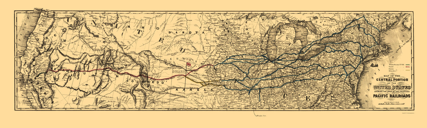 Railroad Map - United States Proposed Central Pacific Proposed - 1850 - 23 x 76 - Vintage Wall Art