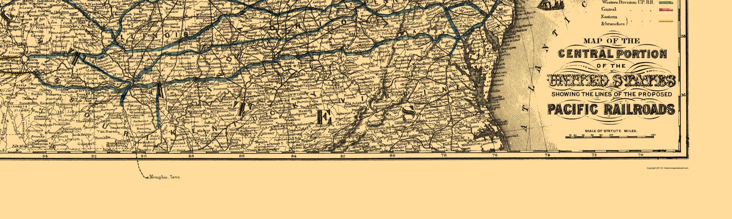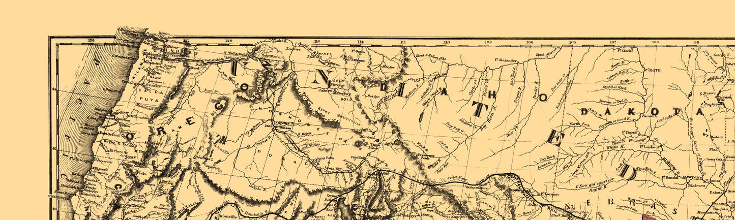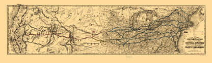 The following towns are featured: a strip map of the United States between 36 degrees and 47 degrees north latitude. It shows drainage, relief by hachures, state boundaries, place names, and some trails in the western half of the map. The intent was to Indicate proposed lines for the western, central, and eastern divisions of the Union Pacific Railroad.