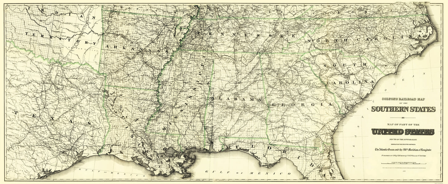 Old Railroad Map - United States Southern Railroads - Colton 1883 - This is an exquisite full-color Reproduction printed on high-quality gloss paper, art paper or canvas.