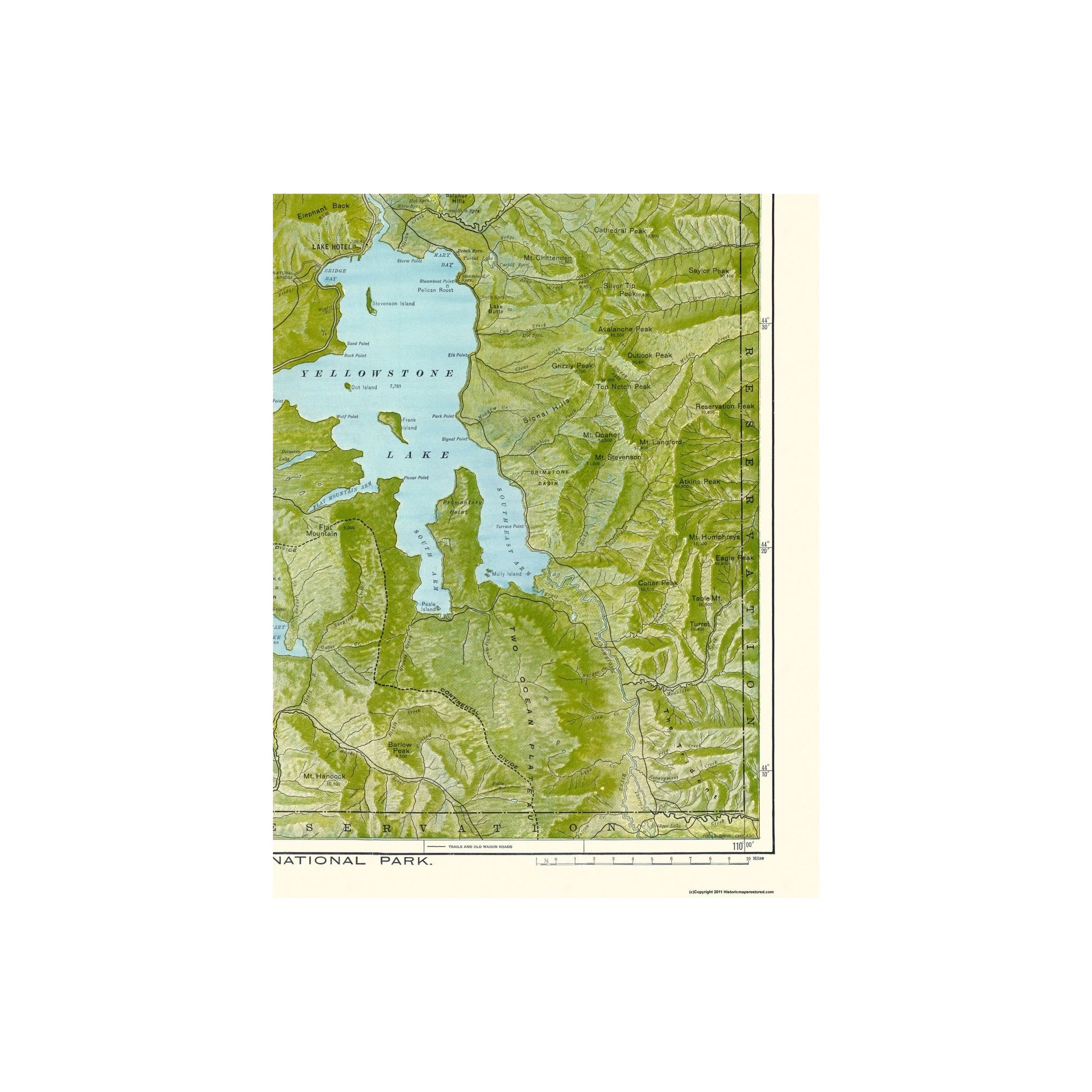 Sites and Townships Specific To This Map Are: Pitchstone Plateau, Lewis Lake, Shoshone Lake, Shoshone Geyser Basin, Continental Divide, Madison Plateau, Lower Geyser Basin, Fountain Hotel, Old Faithful, Lunch Station, Upper Geyser Basin, Miway Geyser Basin, Madison River, Firehole River, Gibon Canon, Mt. Schurz, Norris Geyser, Roaring Mountain, Obsidian Cliff, Crawfoot Ridge, Christmas Tree Park, Trilobite Point, Mt. Holmes, Quadrant Mountain, Gallatin Range, Mammoth Hot Springs Hotel, Mt. Everts, Yellowstone River, Amethyst Mountain, Specimen Ridge, Mt. Washburn, Solfatara Plateau, Canon Hotel, Grand Canon, Hayden Valley, Sulphur Mountain, Central Plateau, Elephant Back, Lake Hotel, Yellowstone Lake, Red Mountains, Heart Lake, Two Ocean Plateau, the Trident, Table Mountain, Mt. Humphreys, Mt. Chittenden, Pelican Cone, Mirror Plateau, Northern Pacific Railroad, plus many more peaks, creeks, hills and geysers.