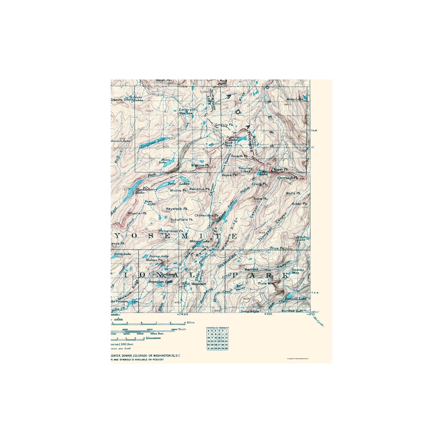 The following towns are featured: Middle Fork Stanislaus River, Golden Canyon, and many other geological points. Yosemite National Park is located on a small portion of this map.