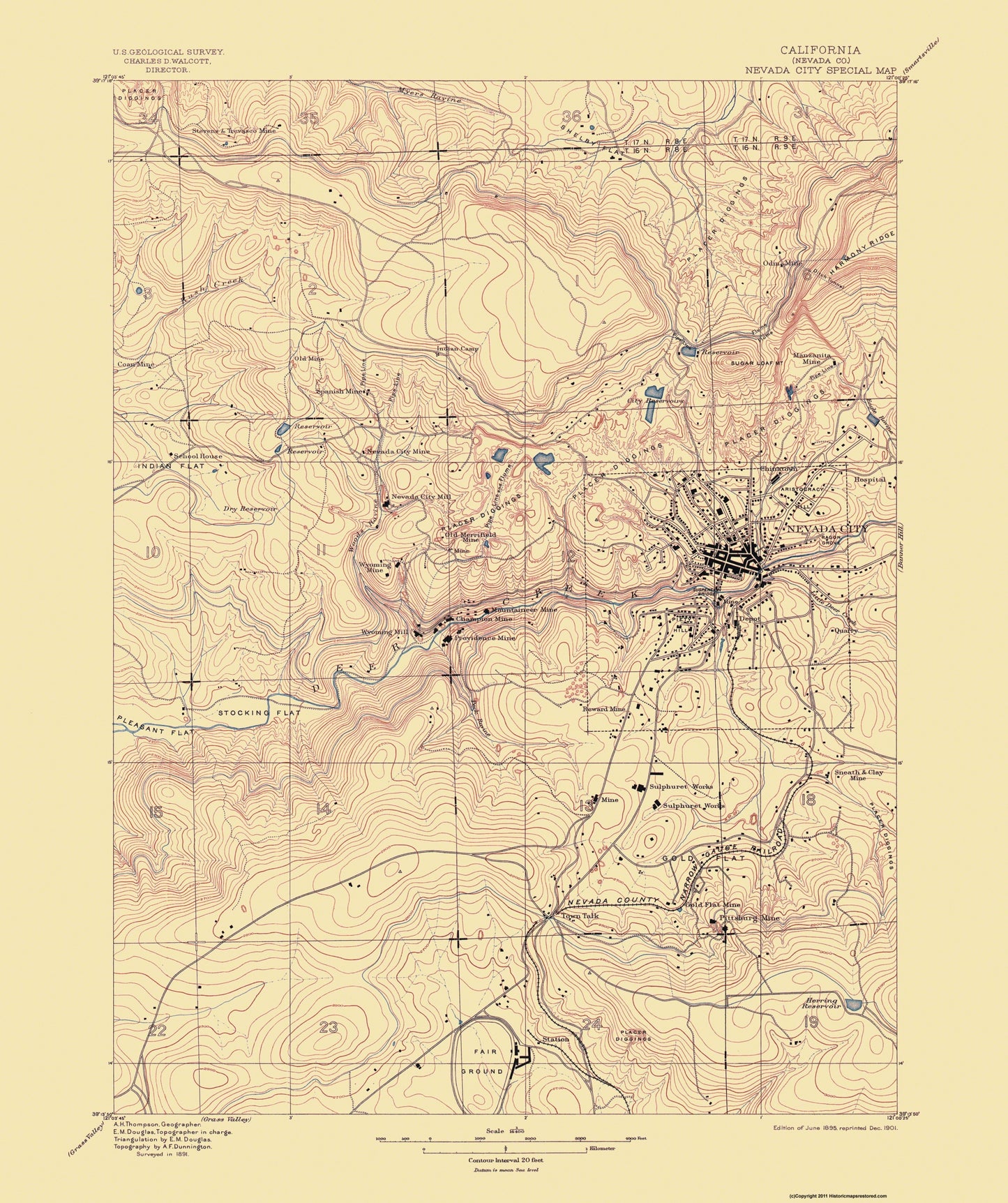 Topographical Map - Nevada City California Special - USGS 1895 - This is an exquisite full-color Reproduction printed on high-quality gloss paper, art paper or canvas.
