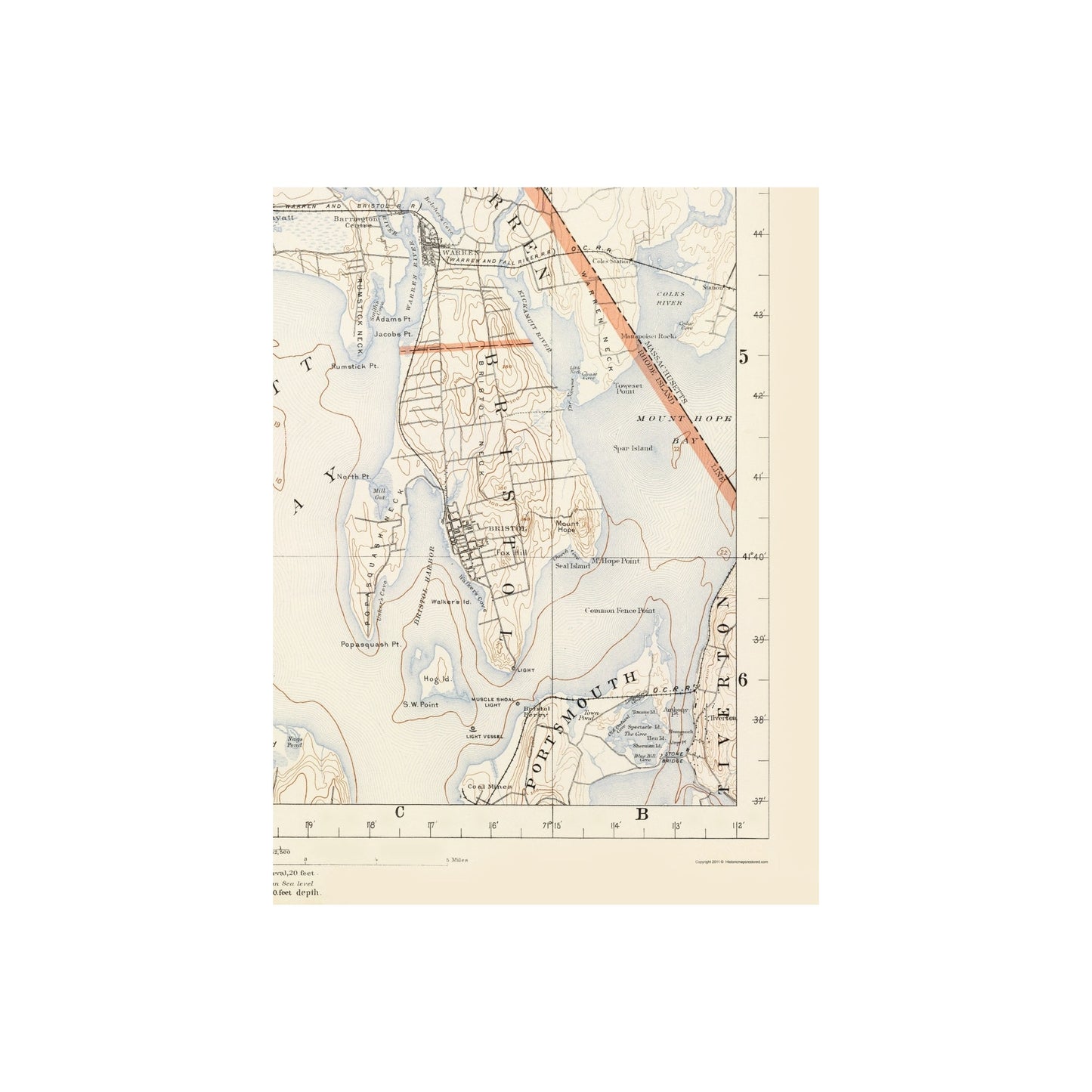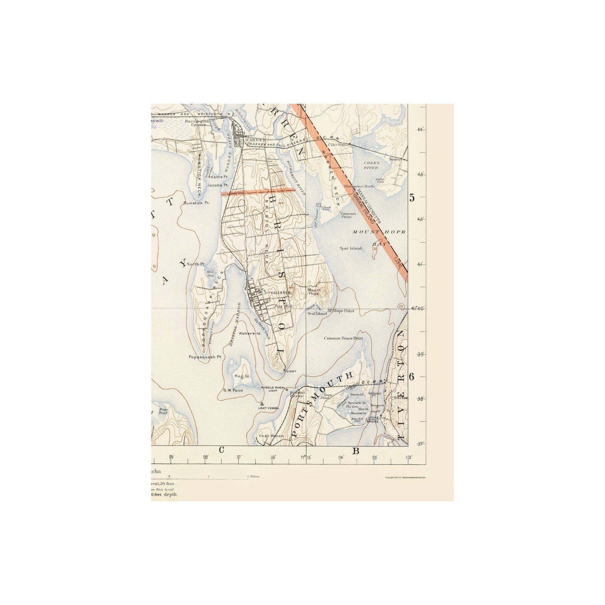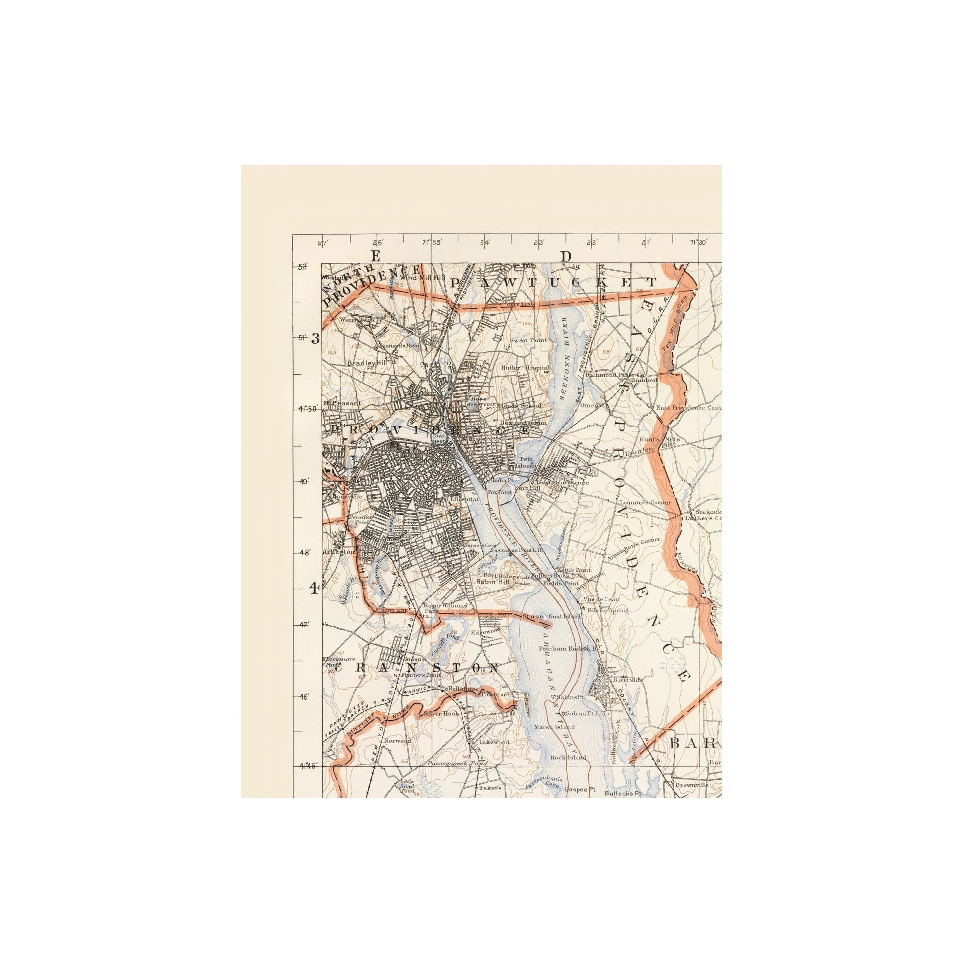 The following towns are featured: the municipalities of North Providence & Providence, Pawtucket, Cramstpm. Barrington, Warwick, Bristol, Portsmouth, and North Kingston. Landmarks include Greenwich Bay, Narraganset Bay, Providence River, Seekonk River, and others. Rail lines are shown throughout.