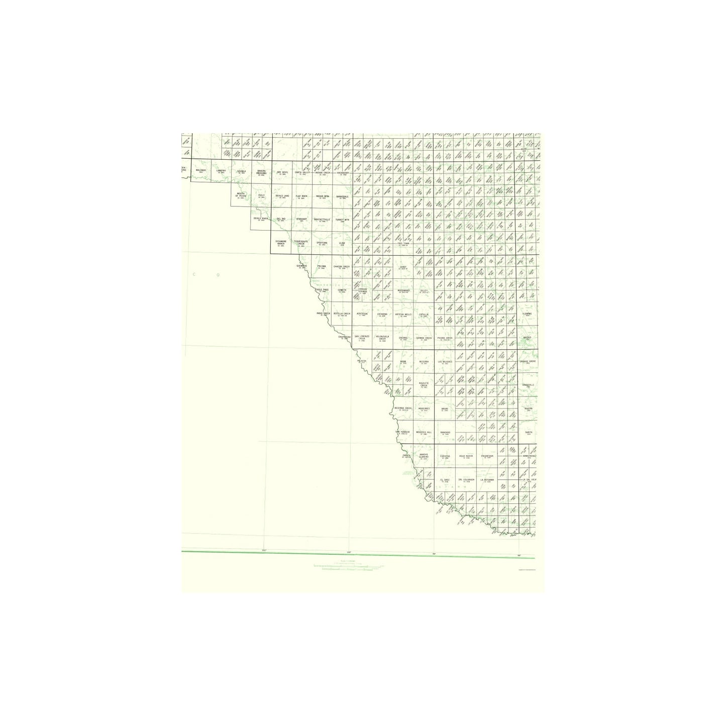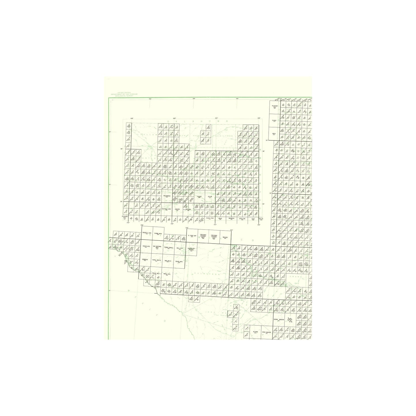 The following towns are featured: This map is a visual index of the mapped topographic quadrangles (or mapped rectangular areas) that comprise West Texas. In the bottom left corner of the map are examples and relevant information concerning the map.